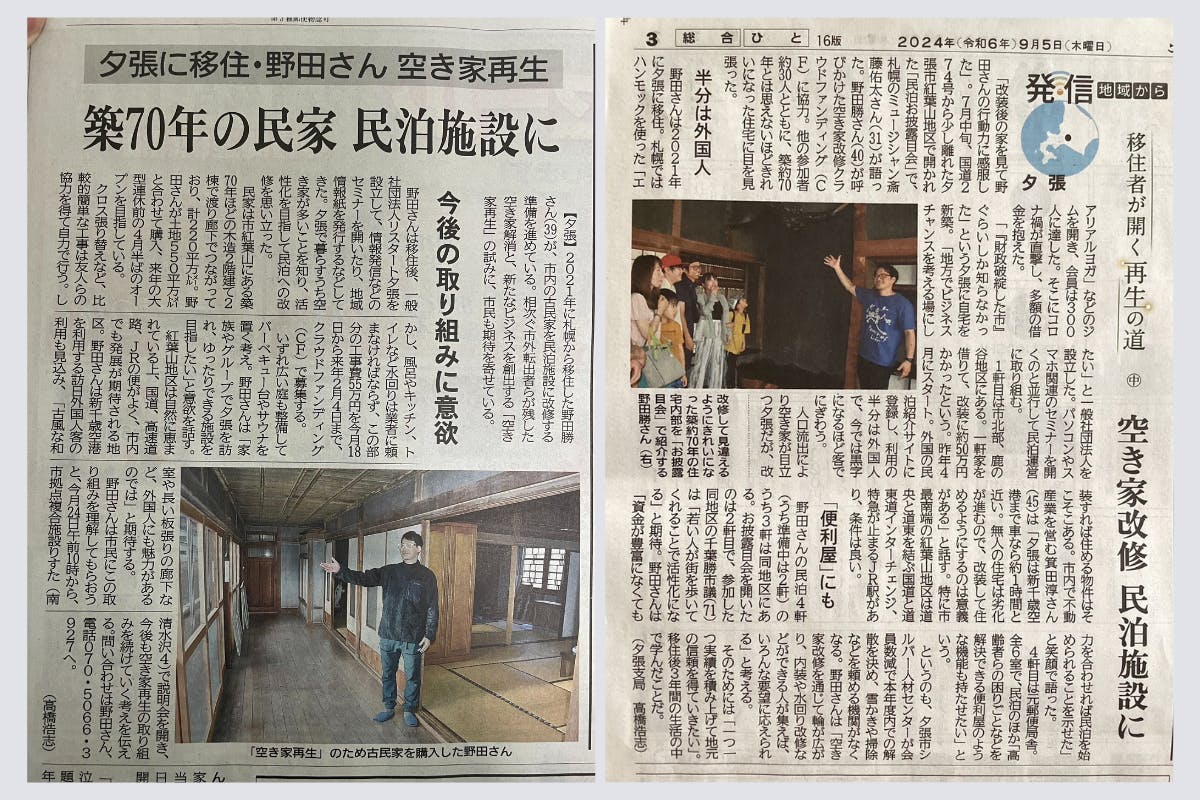 移住してからは、ビジネスのオンライン化で事業を必死に立て直しながら、『地域に根付いて地域と共に創り続ける』覚悟を見せるのが第一だと思い、2023年4月に「一般社団法人リスタート夕張」を設立し、現在は空き家再生プロジェクトを進めています。