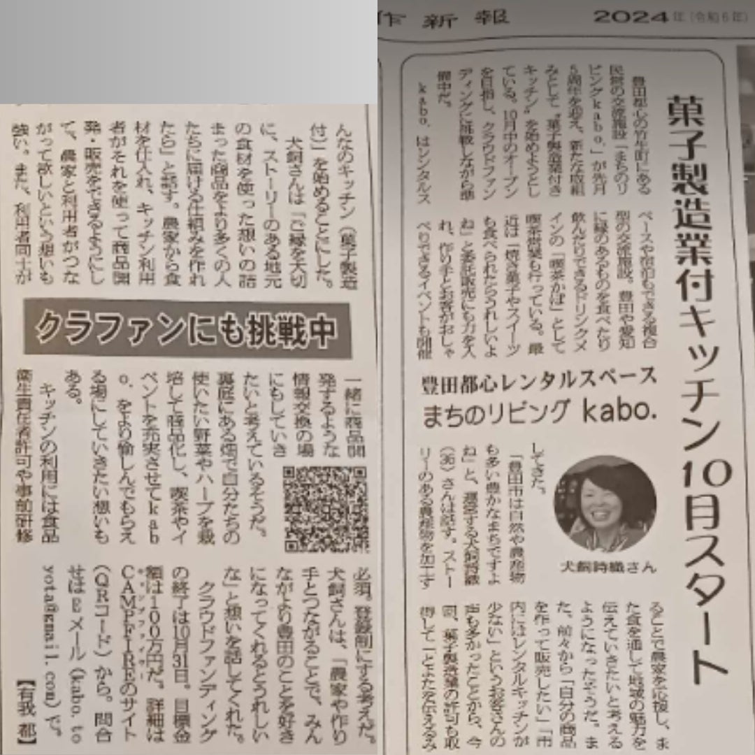 クラファン終了日の10月末まであと15日となりました!ご支援くださっているみなさま、ありがとうございます^^ご報告が大変遅くなりましたが豊田市のローカル新聞といえば!な「矢作新報(やはぎしんぽう)」さんの9/27(金)記事で取り上げていただきました!ありがとうございます^^矢作新報さんは、豊田の話題がたくさんのっていて豊田市の最近の情報をみるなら絶対におすすめの新聞です^^kabo.にも置いてあるので、店内でゆっくりとぜひお茶しがてら新聞も見てみてくださいね!急ピッチであれこれすすめていますが無事に菓子製造キッチンの稼働がはじまっています◎こちらも別記事にて報告させていただきますね。本日もモーニング営業の横でこちらの記事書いております。朝からパンの焼けるにおいがするなんて幸せな時間。のんびりと遊びにきてくださると嬉しいです!菓子製造キッチンをつかった出店のお知らせも合わせてまたさせてください。