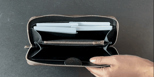 流行りに流されてコンパクト財布に移行してみたものの使いづらくて、長財布に戻ってしまっていました。そんな最中、極小の長財布という願ったり叶ったりのサンプルが完成したので使ってみたら、想像通り使いやすいのにコンパクトでした!カードの出し入れもしやすく、ガバッと大きく開くので、中が見やすい。もう、今までの財布には、戻れなくなってしまいました(笑)