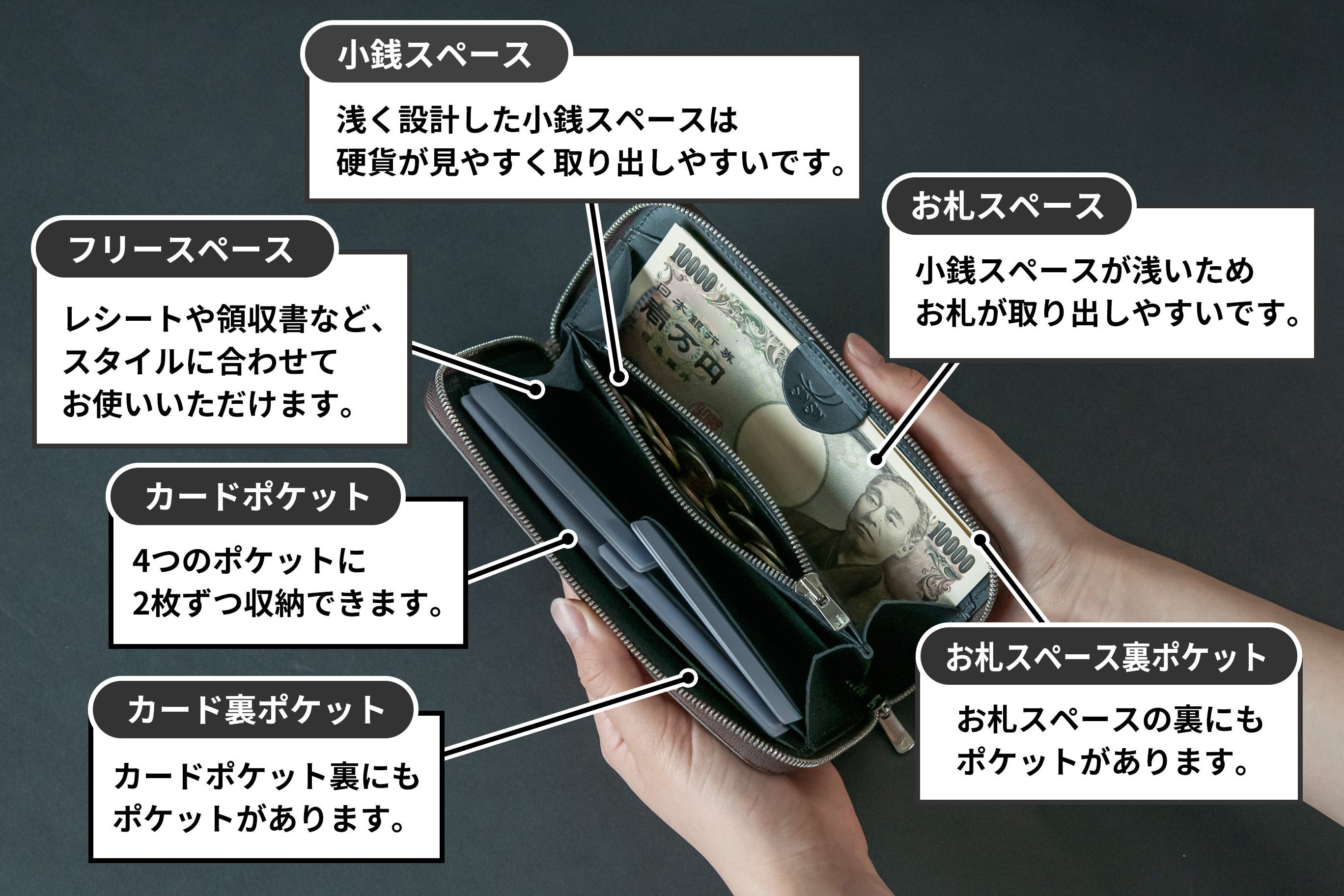 長財布の魅力はなんといっても収納力。従来のラウンドジップ長財布では無駄になっていたスペースを削っただけなので、コンパクトなのに大容量を実現することができました。