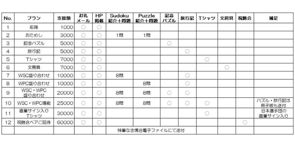 JPFは、日本代表選手団の支援を目的として、昨年初めてクラウドファンディングに挑戦いたしました。プロジェクトページはこちらです。その際は、目標金額100万円に対し、目標金額を大きく上回る1,389,000円の支援をいただくことができました。支援を受けてカナダへ旅立った日本代表選手団は、世界数独選手権2023団体優勝、世界パズル選手権2023個人優勝など目覚ましい成果を挙げることができました。