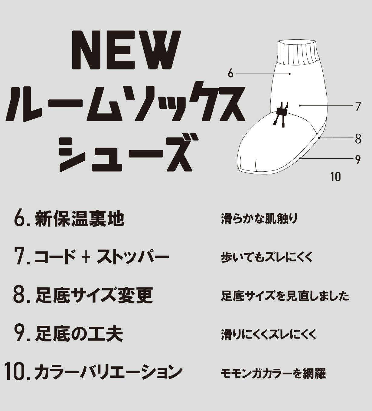 昨年誕生した「ルームソックスシューズ」が歩きやすく進化しました。足首部分をドローコードで調節できるようにし、脱げにくくなりました。足底の素材を変更し更に滑りにくくなりました。これまでご購入いただいたモモンガと色を合わせられるよう色展開を増やしました。暖かさは去年と同等です。とてもとても暖かいです。
