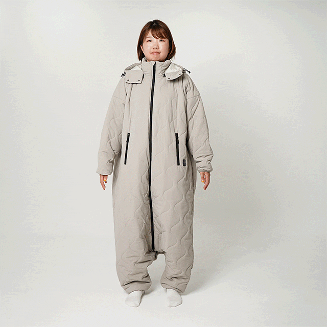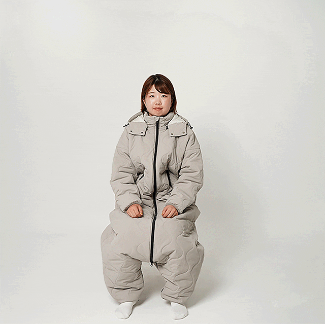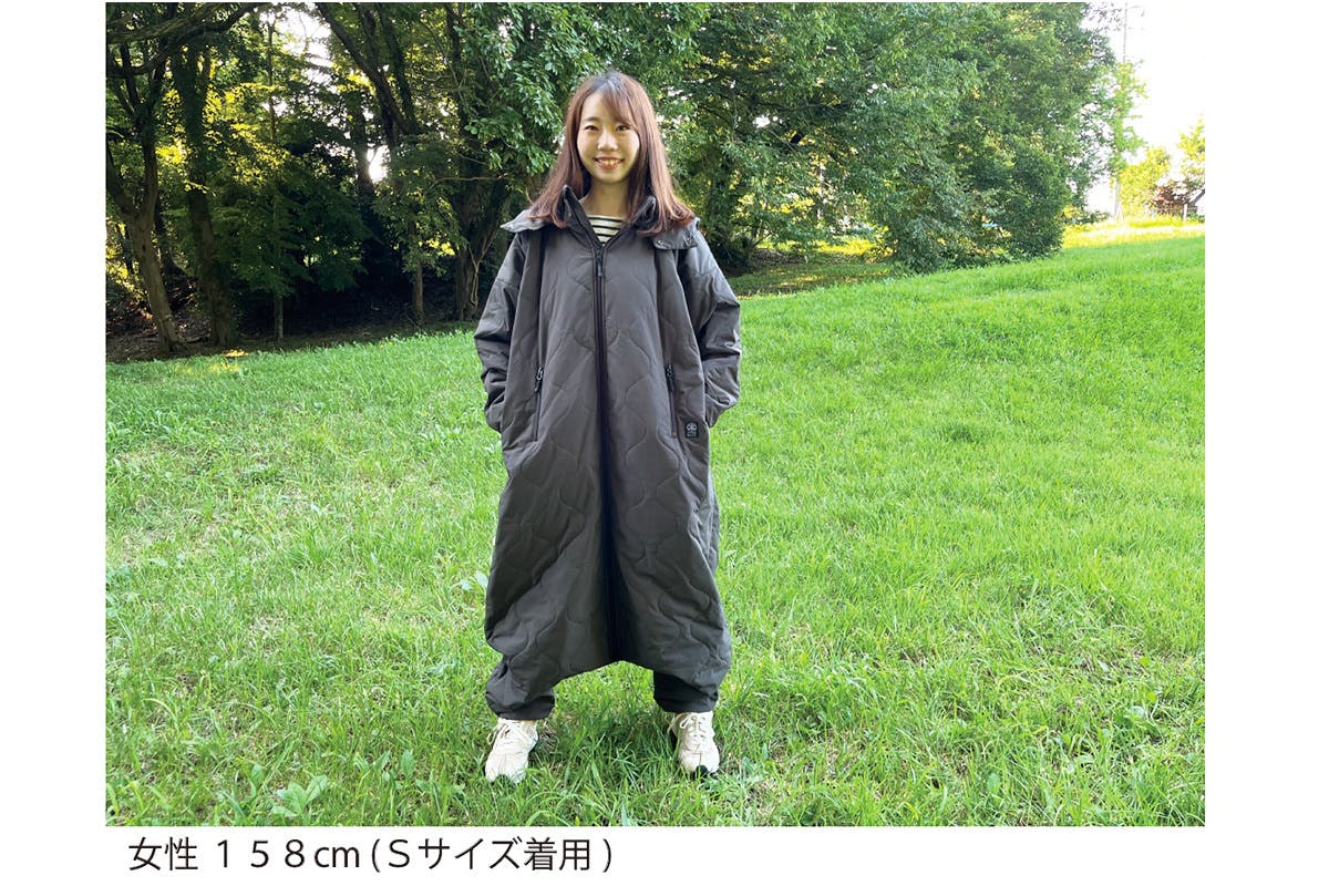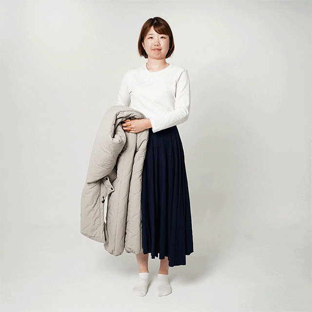封筒型寝袋から派生したデザインはロングスカートでもスーツでもそのまま上に重ねて簡単に着用できます。