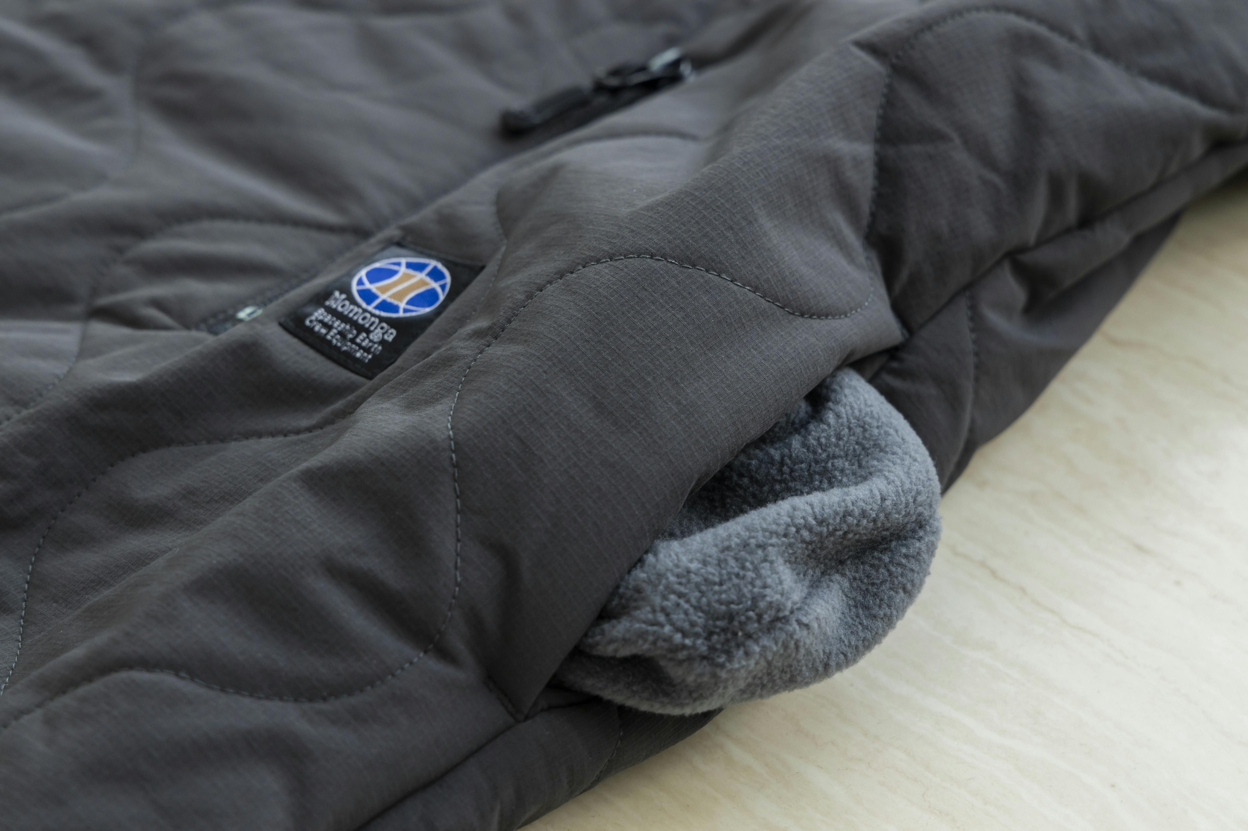 大事なものを収納するファスナーポケットと、手指を温める袋布がフリース素材のボトムポケットを備えています。