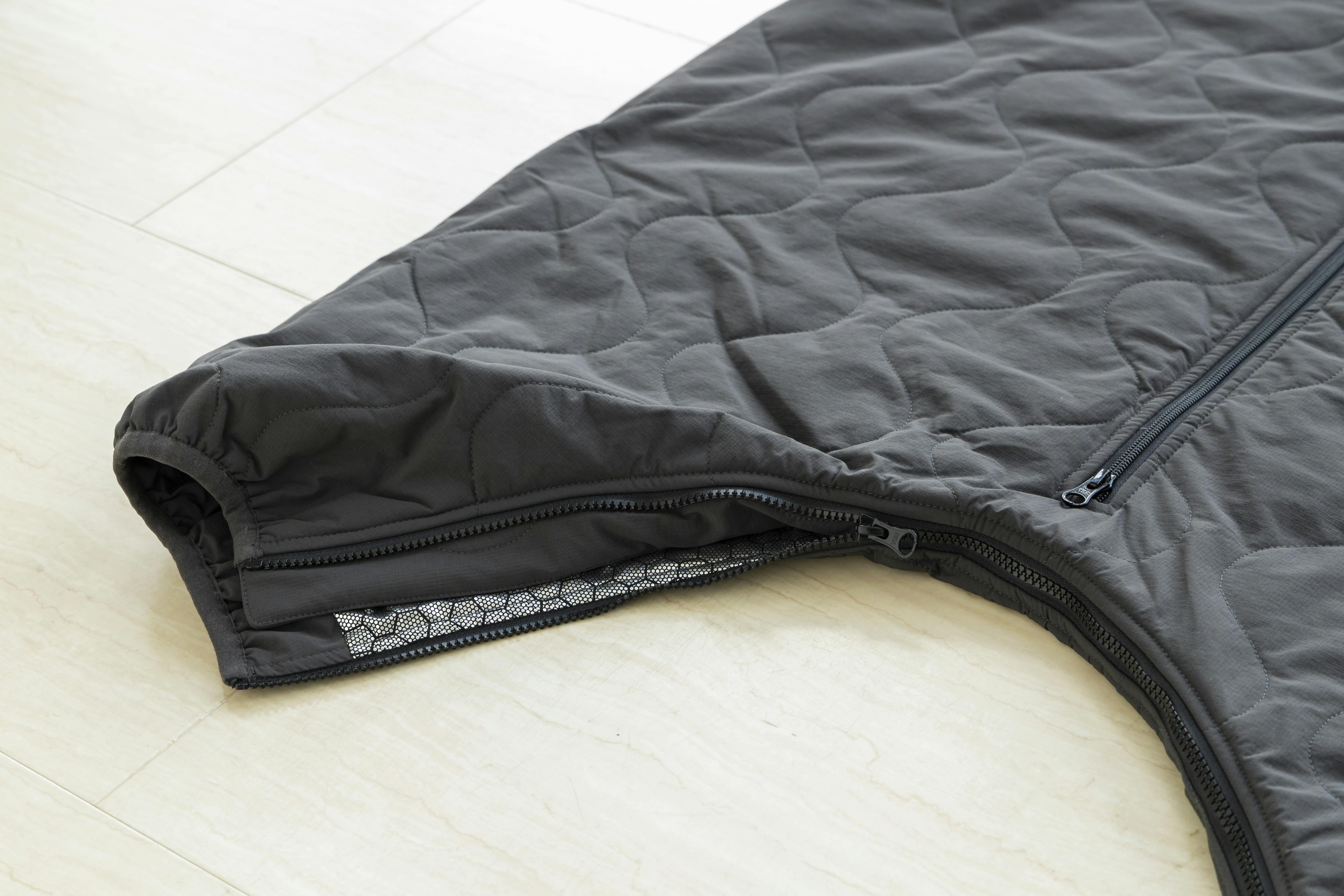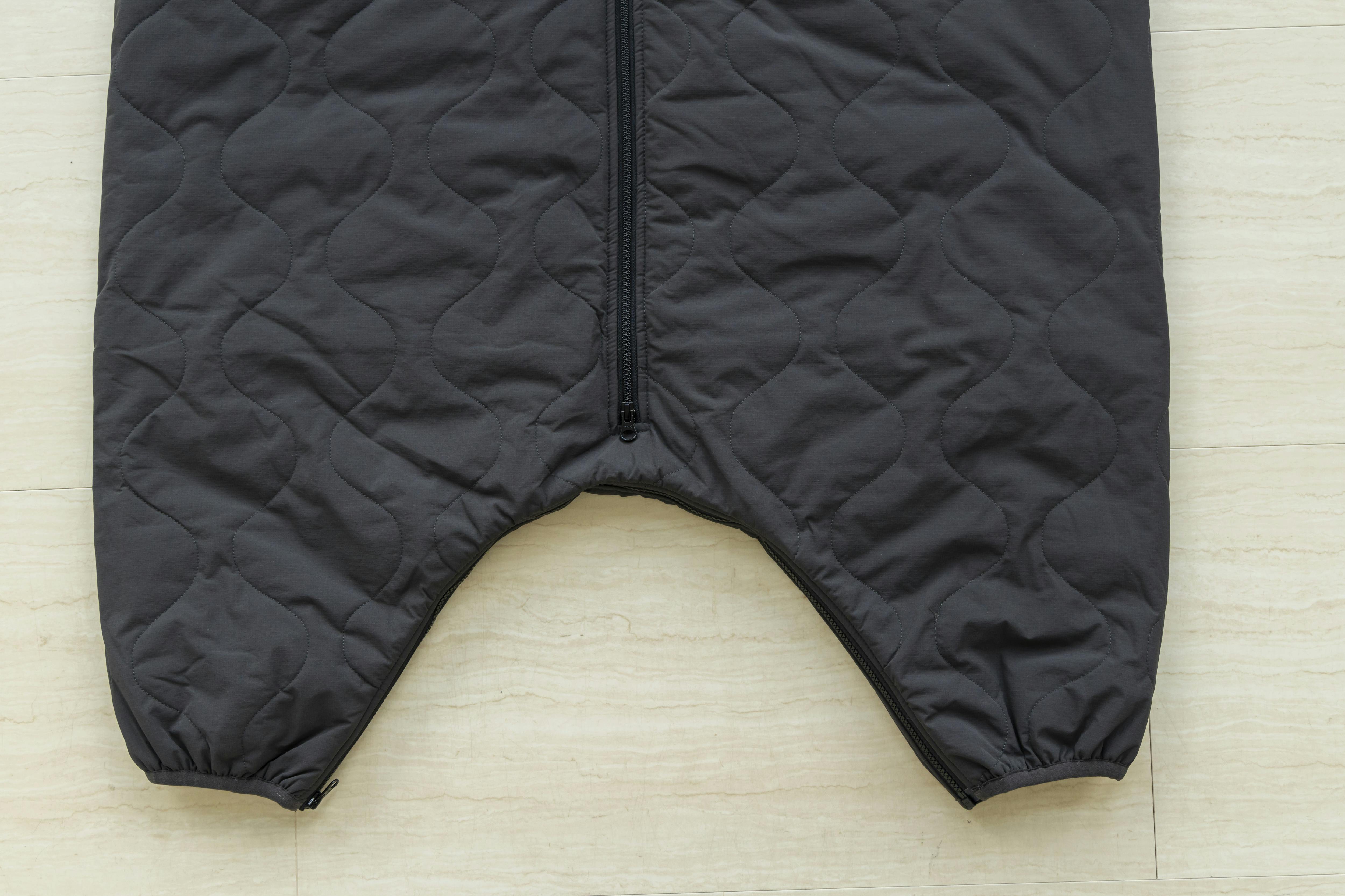 裾まで伸びたファスナーは下からも開くので足を出し入れでき、脱がずにトイレにも対応できます。