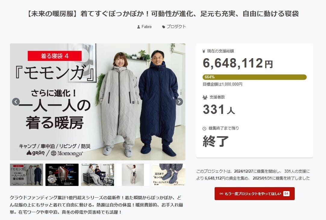 2025/02/03 14:49この度は『【未来の暖房服】着てすぐぽっかぽか!可動性が進化、足元も充実、自由に動ける寝袋』プロジェクトにたくさんのご支援をいただき誠にありがとうございます。【 応援購入総額 : 6,648,112円 】【 サポーター人数 : 331人 】フード脱着や裾部分のファスナーなど今回たくさんの改良をさせていただき、より快適にご使用いただけるモモンガを開発できたと思っております。これからもモモンガシリーズでは進化を続けていきたいと考えておりますので、今回のモモンガをご使用いただきましたら、ぜひ感じたことのご意見をいただけますと今後の商品開発の参考・励みになりますので、幸いです。リターン品のお届け予定は[ 2025年 5月下旬 ]となっております。*本製品は『受注生産』となっておりまして、プロジェクト終了後の「カラー・サイズ」変更につきましては原則としてご対応できかねますのでご了承ください。 もっと見る