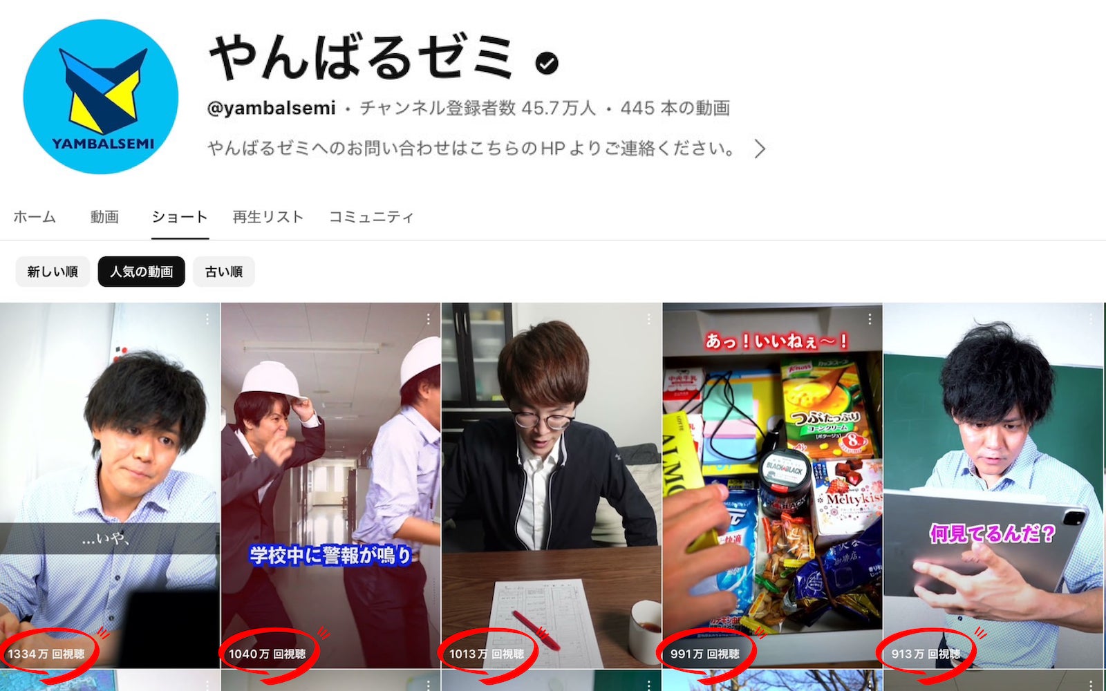 これまでに、100万回以上再生されたショート動画は500本以上あり、その中には1000万回を超える動画も複数あります。