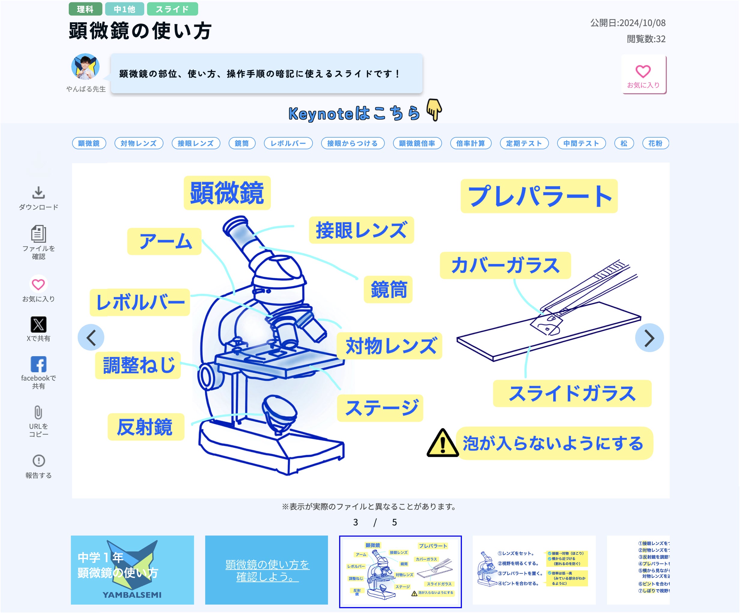 また、YouTubeでも発信していた中学校の理科の授業スライドも全て「せんせい市場」に入っています。