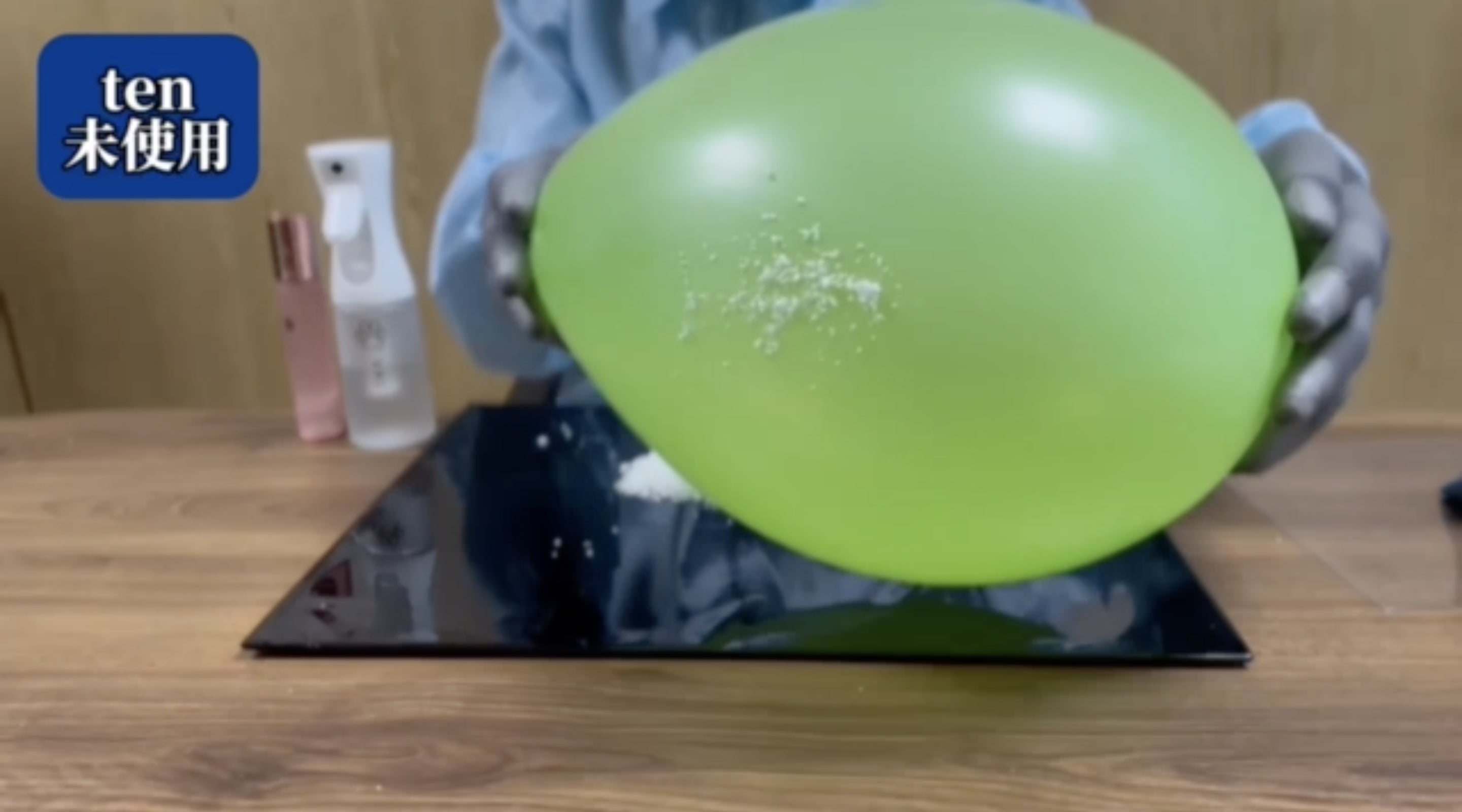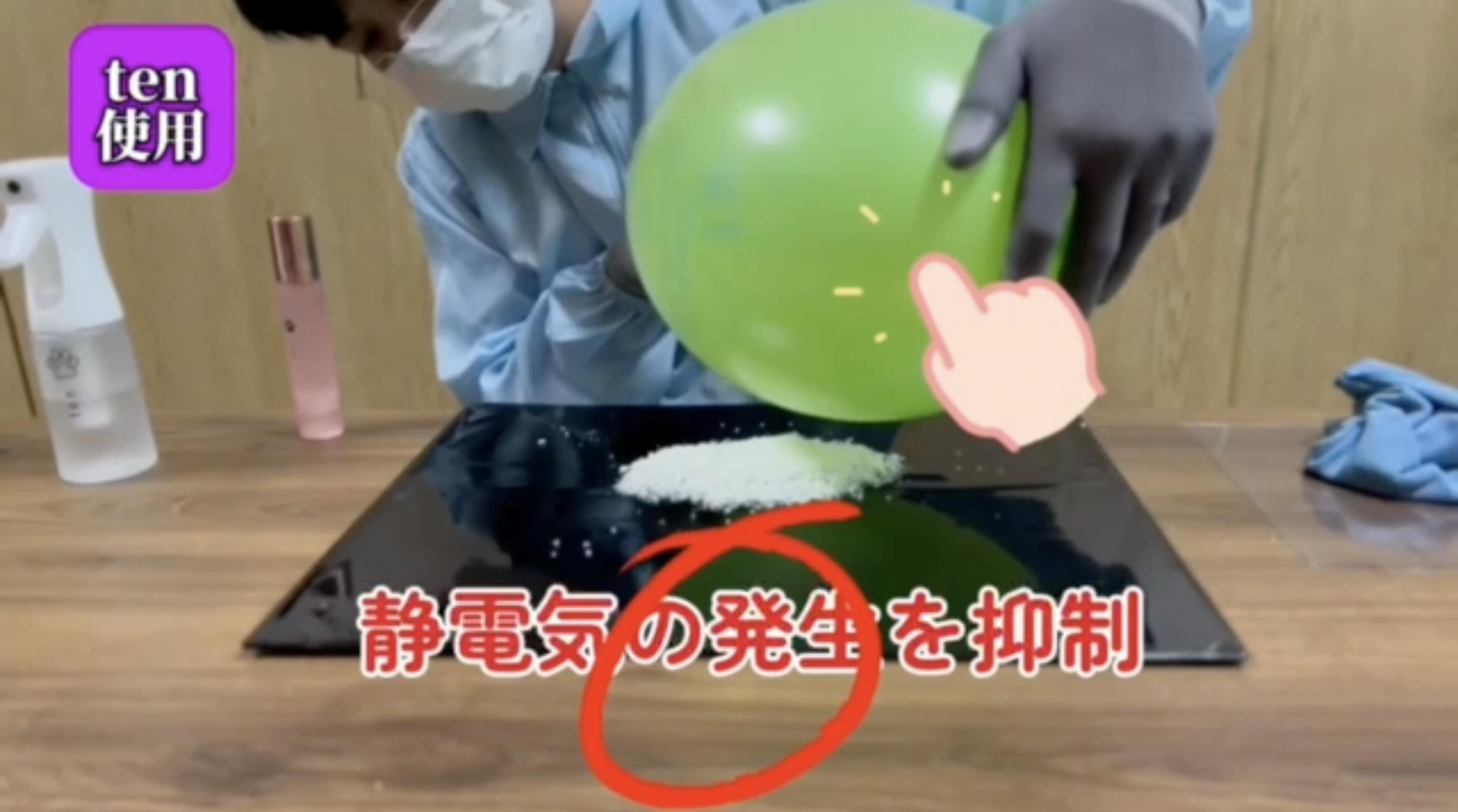 『ten』を風船に振りかけると、静電気の発生を抑制することができます。