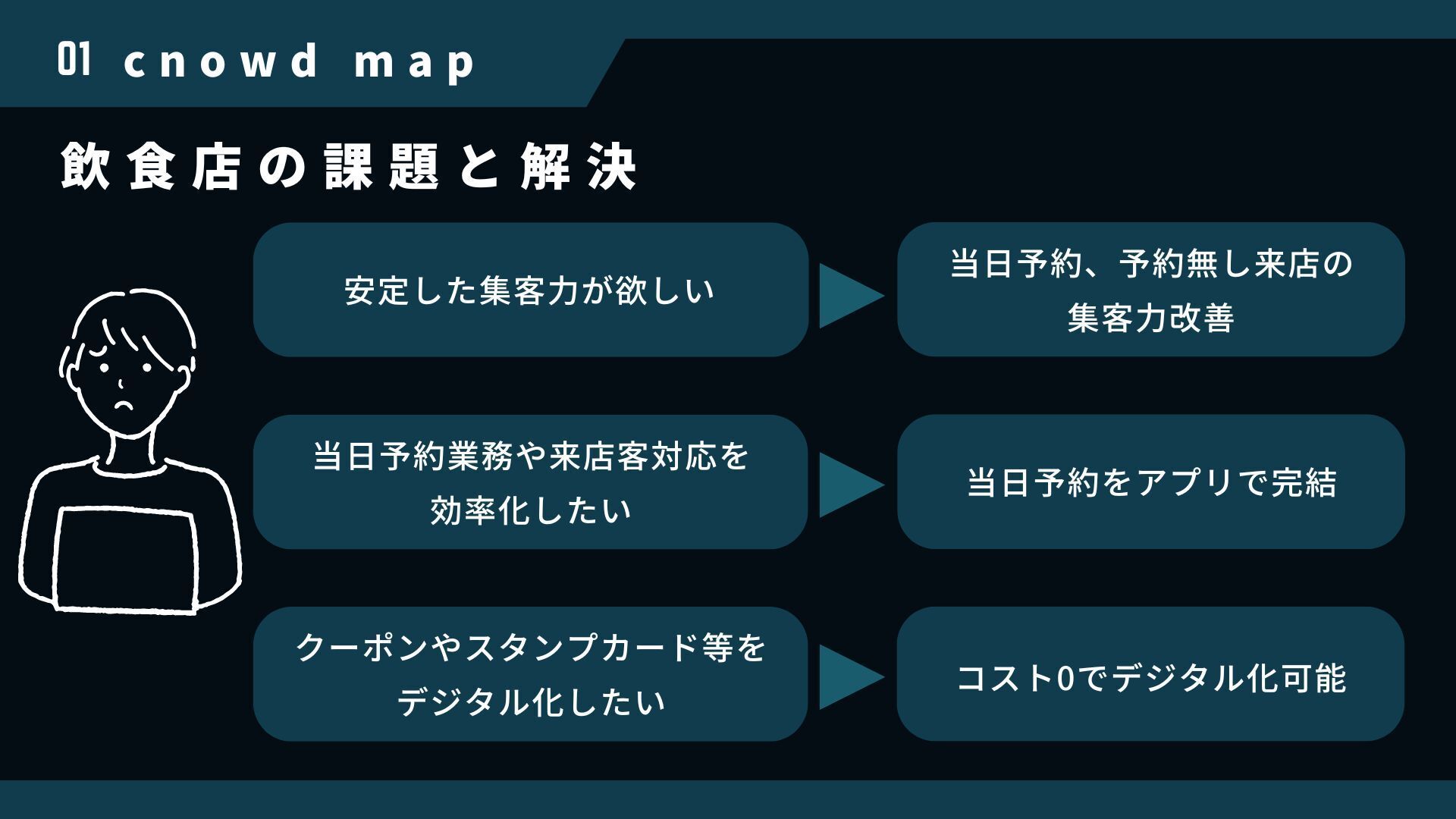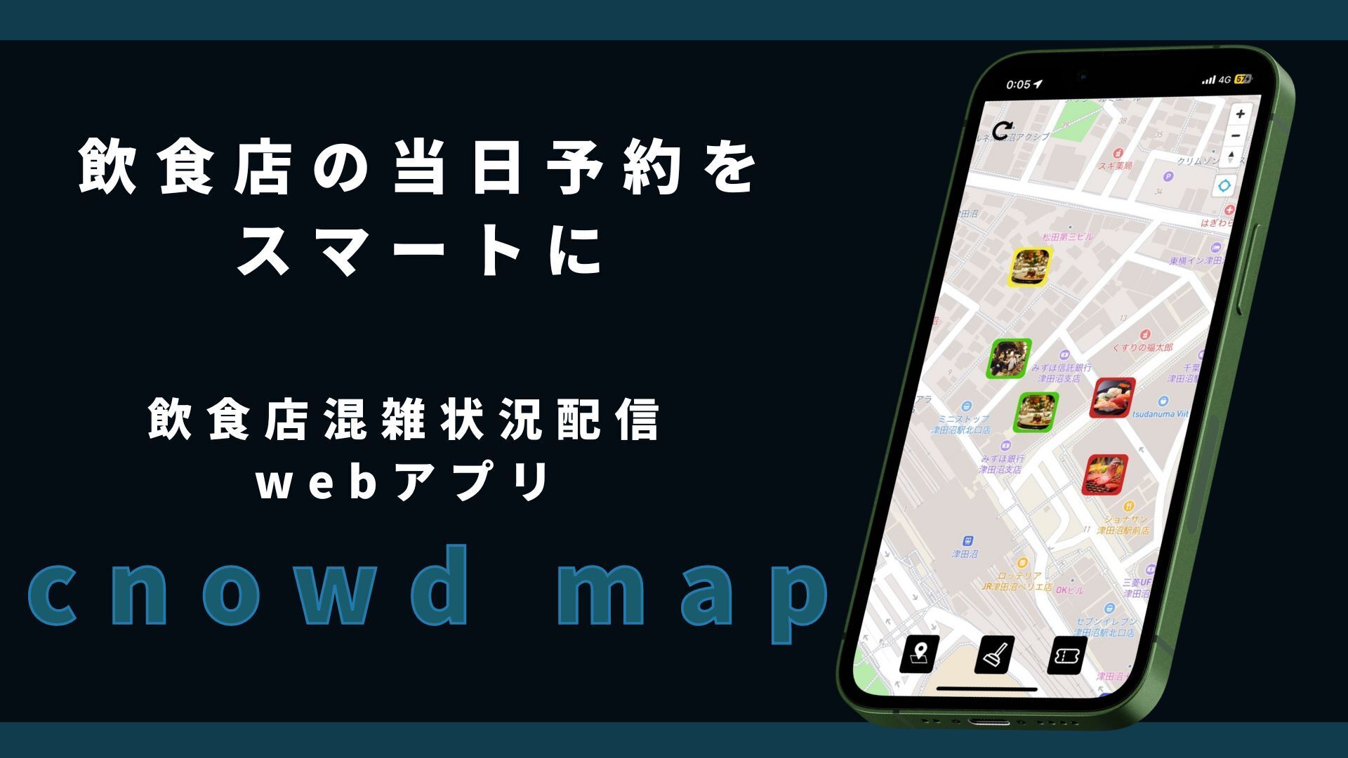 このプロジェクトでは、飲食店の混雑状況をリアルタイムで確認できる位置情報Webアプリ【cnowd map】を開発します。cnowd mapで、今すぐ入れるお店の比較・決定から、予約まで完結できます。