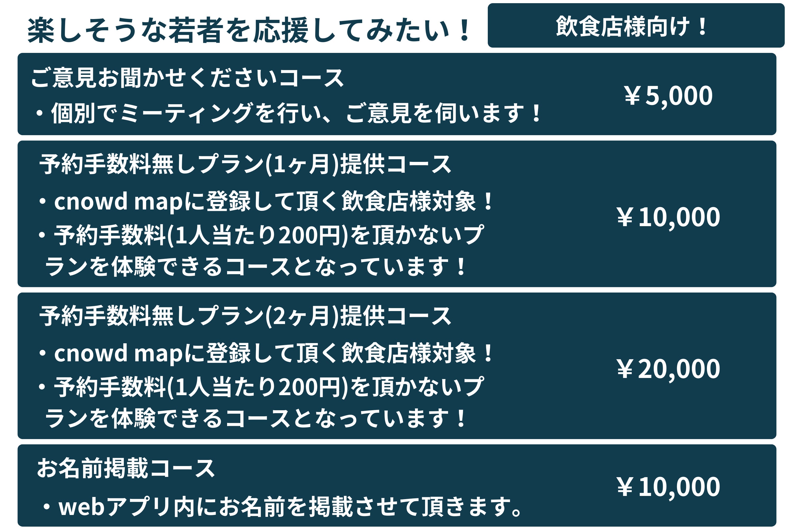 2024/10/27 13:44こんにちは! 金額募集最後の活動報告となるので、ぜひ最後まで読んでいただきたいです!今回プロジェクトの最終日ということで、・cnowd mapの現状・今後の予定・感謝について伝えさせてさせていただきます。【cnowd mapの現状】11月からのリリースに向けて現在、7店舗(津田沼5店舗、船橋2店舗)の飲食店様に導入して頂いております。検証実験中にも加盟店舗を追加していこうと思うので、是非追加して欲しいお店等ございましたらご連絡ください!【公式インスタグラム開設!】加盟店舗の空席情報等を発信するcnowd map公式インスタグラムが開設されたので、ぜひフォローして、最新の店舗情報をチェックしてください!加盟店舗のご紹介もさせて頂いております!公式インスタ cnowd map【検証実験中のユーザー獲得戦略】・各加盟店舗へのポップアップの掲載・津田沼、船橋駅前でのチラシ配り・SNS広告【ご協力のお願い】是非ともcnowd mapを使っていただき、使用した感想等を頂けると嬉しいです!一緒にcnowd mapを改善して頂きたいです。※ユーザーアンケートは11.12月末に行う予定です。【今後の予定】検証実験の結果や店舗、ユーザーのご意見をもとに改良を加え、正式リリースに向けて活動していきます。正式リリース時には、まずエリアを総武線沿いに絞り店舗を拡大していこうと思います。各路線沿いの店舗とユーザーを獲得して、新たなグルメサイトとして拡大します。(路線選定等についてもユーザーアンケート時にお聞きする予定です。)【最後に】クラウドファンディングを開始して約1ヶ月ありがとうございました。もちろんご支援頂いた方は全員お一人ずつ把握していますし、お礼のメッセージにて個別に感謝を伝えさせて頂きます。併せて、私達のプロジェクトを多方面で支えてくださった多くの皆様大変ありがとうございました。まだ残り10時間ほどございますので、目標の20万円までご支援して頂けると大変嬉しいです!玉上 寛太 もっと見る目標23%達成!!ついにあと3日です。