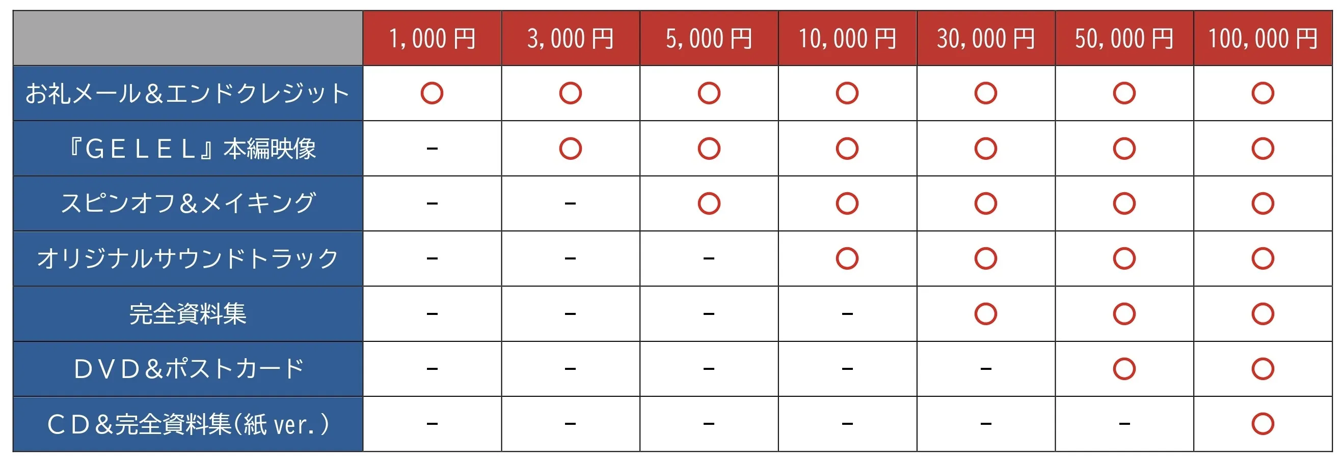 リターンはご支援いただいた金額が上がるごとに追加されていきます。