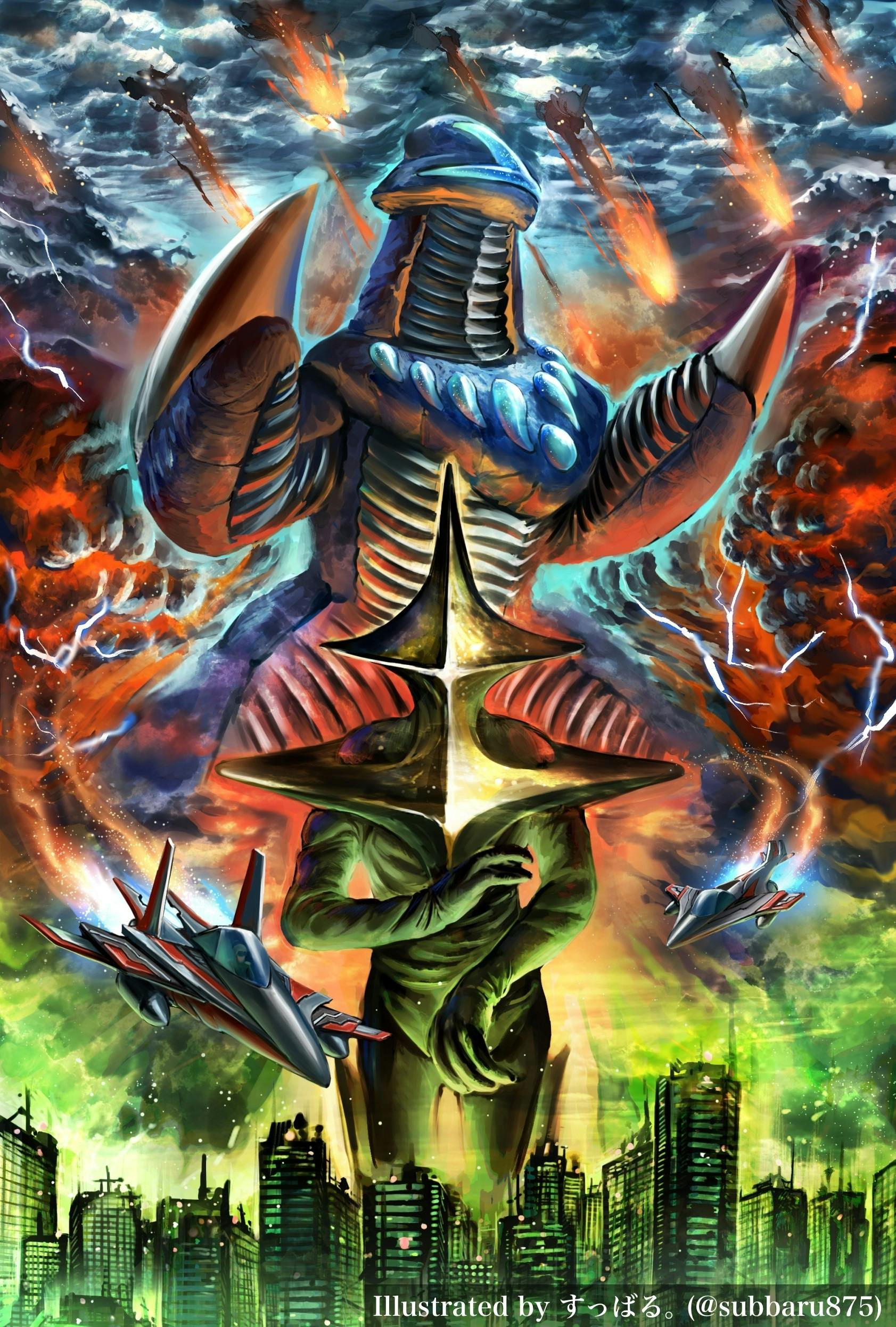 特撮らしく、メインキャラ達がドーーン!と目立つように描きました。映像化された時の様子を想像しながら、怪獣は力強さを表現するために爆風に包み、巨人はどこか不気味で奇怪な様子を描きました。怪獣と巨人のコントラストを感じとって頂けると嬉しいです。 (メインビジュアル:すっばる。)