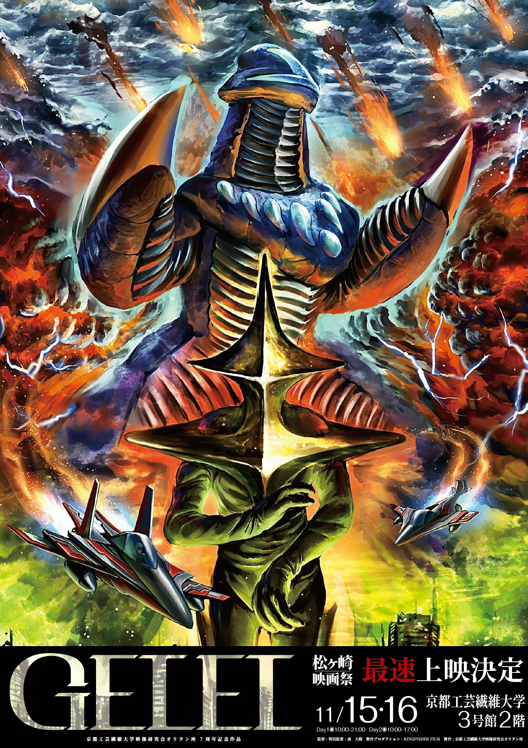 2025/11/07 18:002025年11/15(土)、16(日)に開催される京都工芸繊維大学の学園祭(松ヶ崎祭)にて、自主特撮映画『GELEL』最速上映会を行います。↓京都工芸繊維大学の場所https://maps.app.goo.gl/8dGZ4MdBgjyM8t3p6当日のタイムテーブルは以下の予定です。また、イベントに合わせて、本作に登場する怪獣“メルトロン”のチェキ撮影会の開催も決定しました。作中の戦闘機コクピットの試乗体験&記念撮影、作中小道具の展示や物販も行う予定です。詳細はX(Twitter)やInstagramをご覧ください。https://x.com/Gelel_officialhttps://www.instagram.com/gelel_tokusatsu/なお、支援額1,000円以上のリターン「お礼メール」及び3,000円以上のリターン「本編完成映像」の送付は11/15(土)朝9:00頃を予定しております。メールはorion.gelel.official@gmail.comからお送り致します。迷惑メールに振り分けられることのございませんよう、今一度設定をご確認ください。長らくお待たせいたしましたが、完成映像のお届けまであと少しです。楽しみにお待ち下さい。 もっと見る