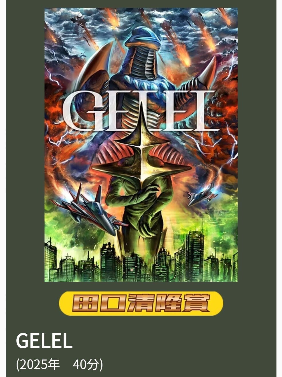 2025/12/24 18:0012月21日に福島県須賀川で開催されました「第24回全国自主怪獣映画選手権 特撮のまち・須賀川大会」にて『GELEL』が上映され、“田口清隆賞”をいただきました。第24回全国自主怪獣映画選手権ホームページこのような素晴らしい賞を賜り、たいへん喜ばしい限りです。これも支援者の皆さまのお力添えのおかげです。重ねてお礼申し上げます。今後も機会があれば上映イベントなどを行っていく予定ですので、応援のほどよろしくお願いいたします。『GELEL』制作スタッフ もっと見るメール送信のお知らせ