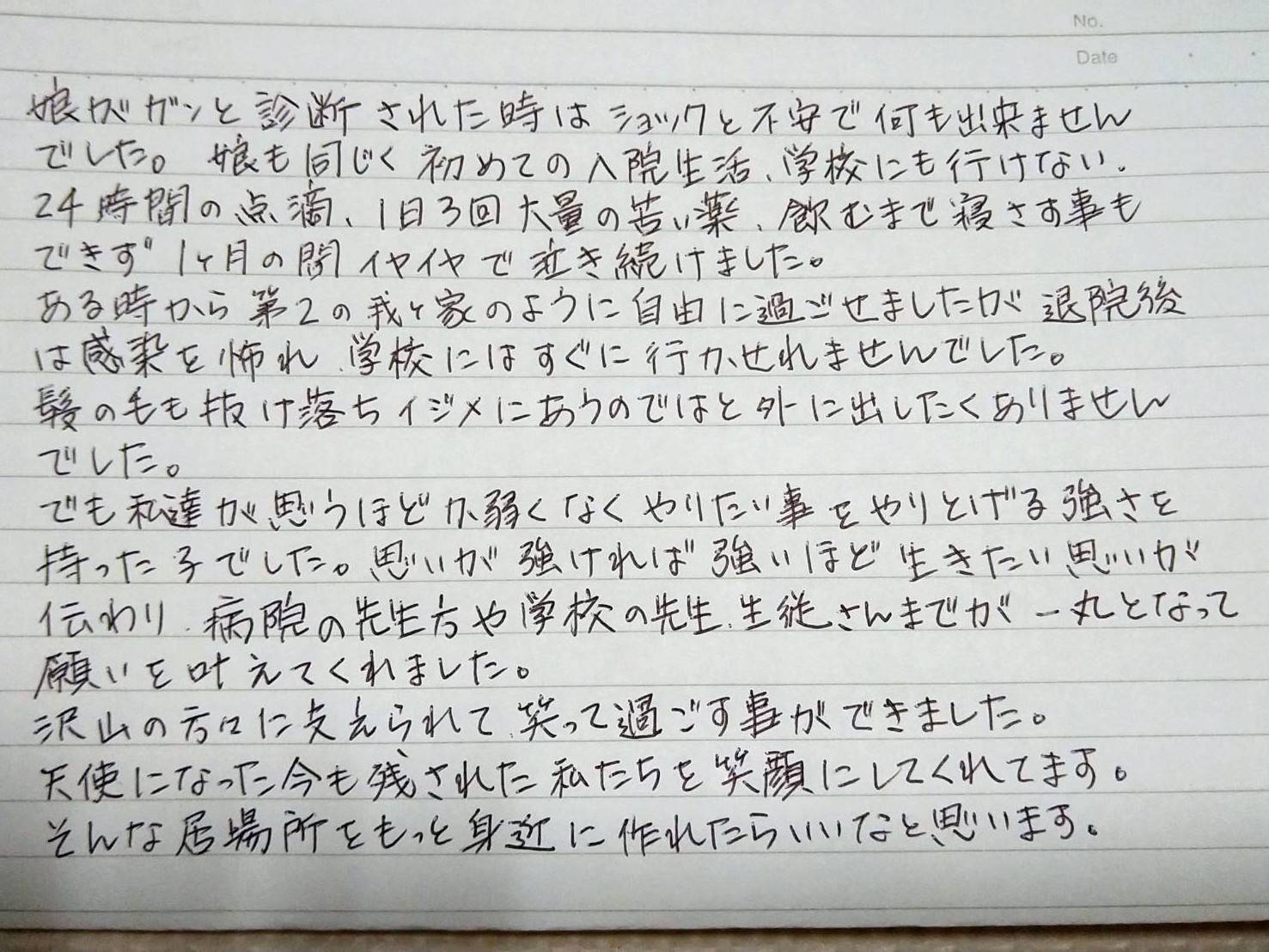 そこには、声を出して涙を流しながら笑っていた子どもの顔が見れたこと、家族として充実した時間が過ごせたこと、そして、穏やかに旅立っていったこと、お礼の言葉と共に書いてありました。