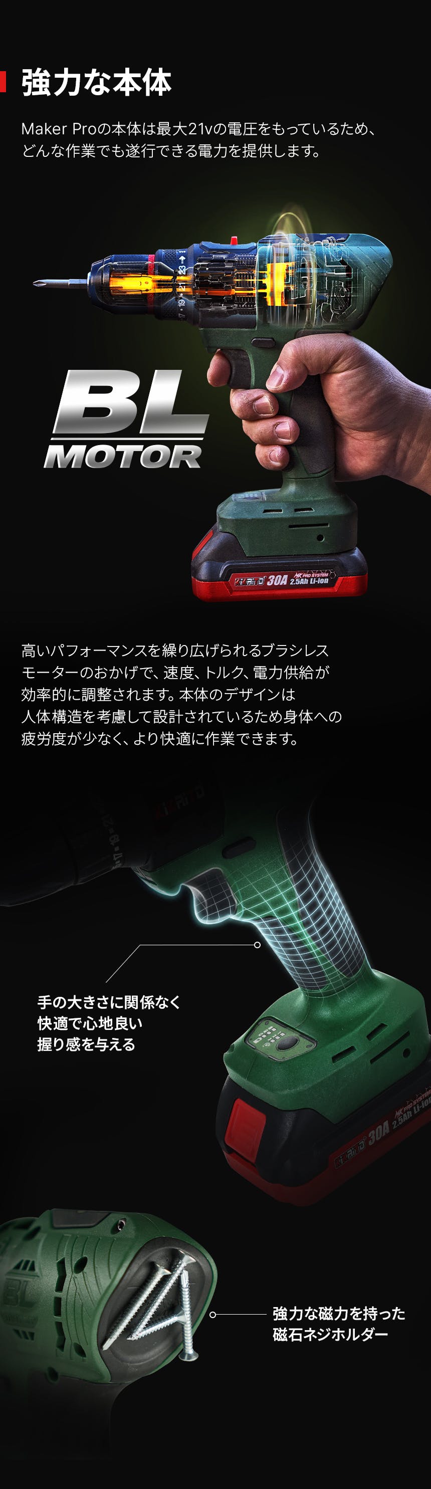 A: Maker PROの本体はブラシレスモーターを使用しており、電力をより効率的に使用するよう設計されています。この設計により、効率的で強力なパワーを供給し、バッテリーの効率を向上させて長時間の使用が可能です。さらに、各パーツは高い耐久性を持っているため、長期間にわたって部品の摩耗を心配することなく使用できます。製品寿命につきましては、パーツごとに耐久性が異なるため、特定のパーツについてお問い合わせしていただければ詳細にお答え致します。