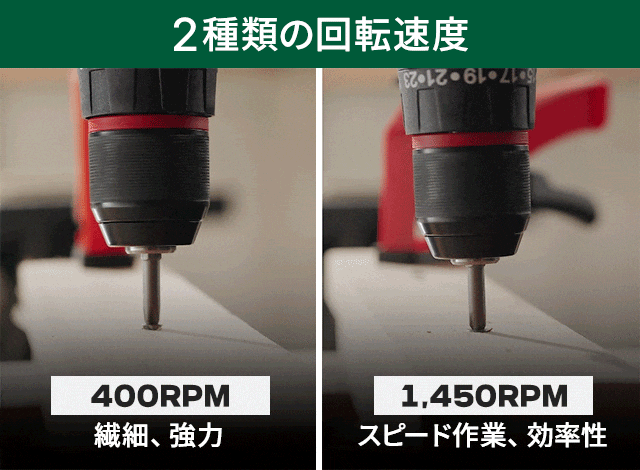 通常の電動ドリルとは異なり、この工具パーツは必要に応じて2種類の速度に切り替えることができます。