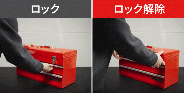 この工具ボックスには、上部が開いている時に限って引き出しが開くように、自動ロック技術が搭載されています。
