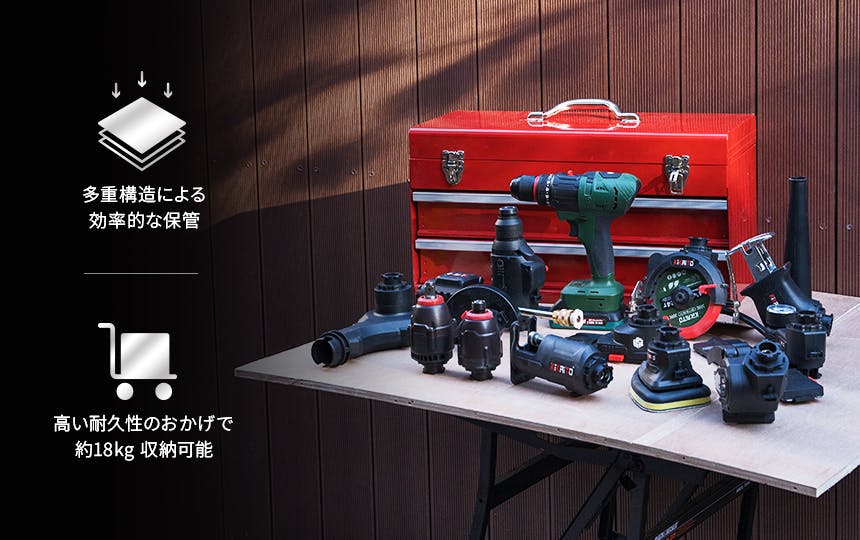 Sinosteel技術を採用したこの工具ボックスは、約18kgの工具を簡単に収納できる他、特殊ペイントを使用しているため錆から守ることができます。
