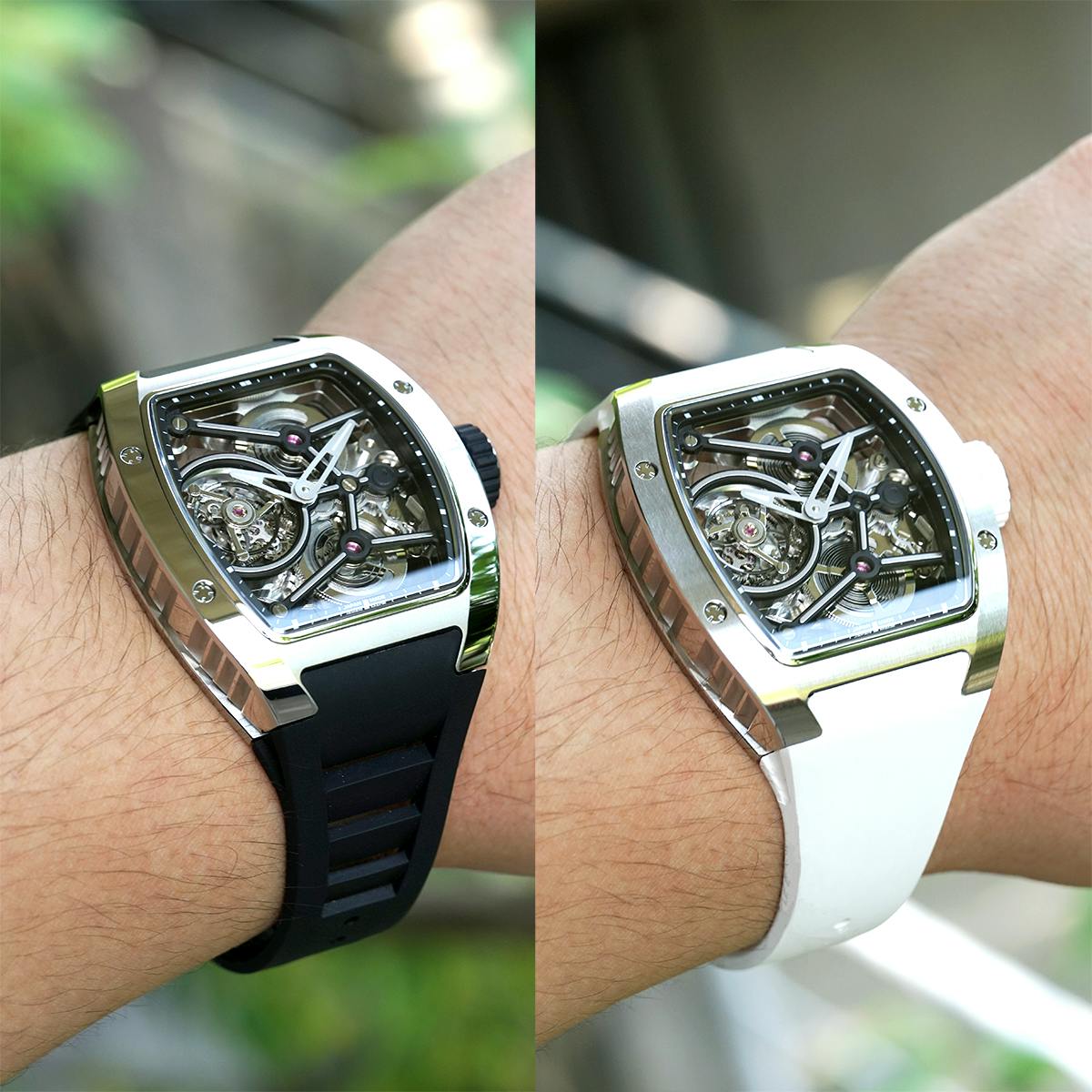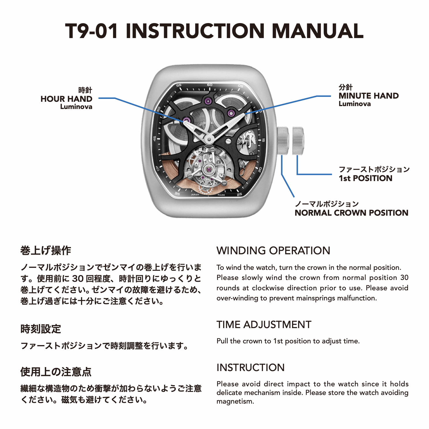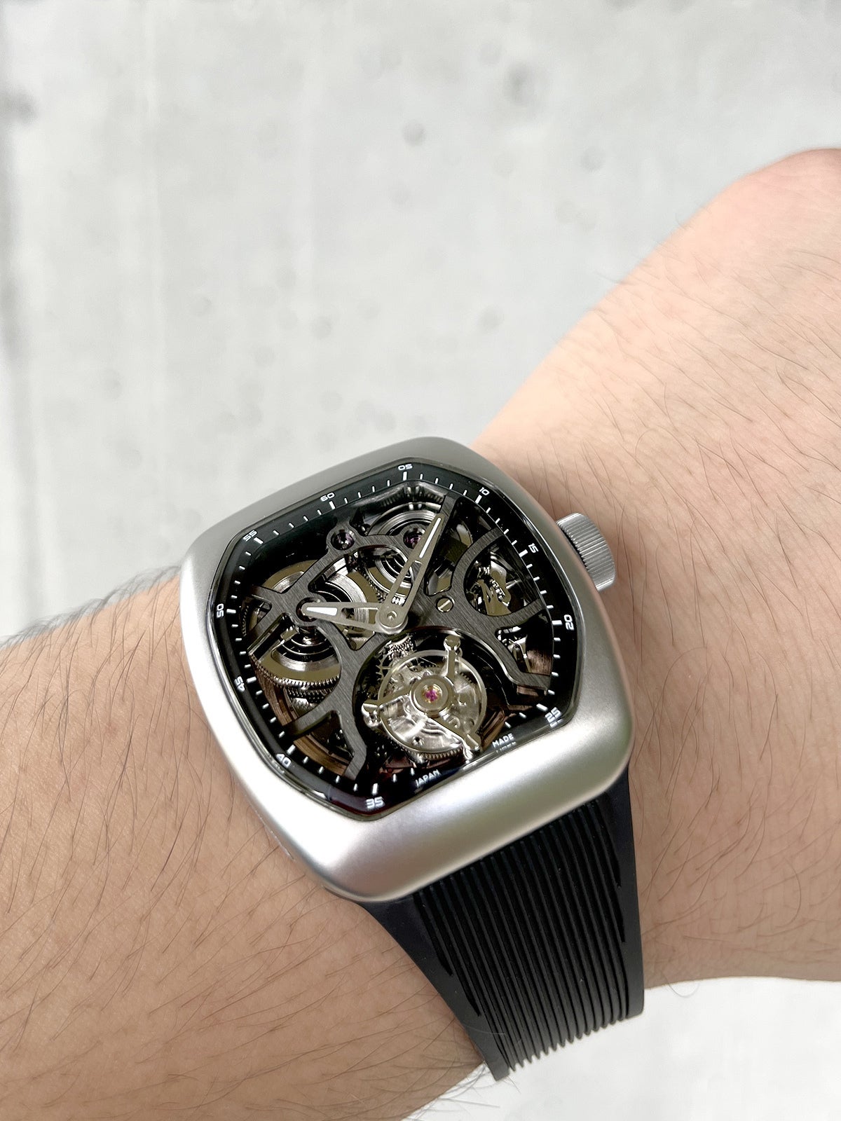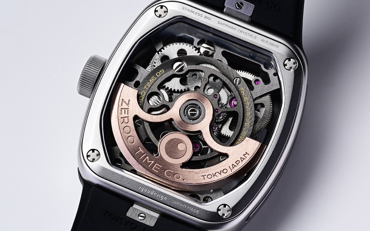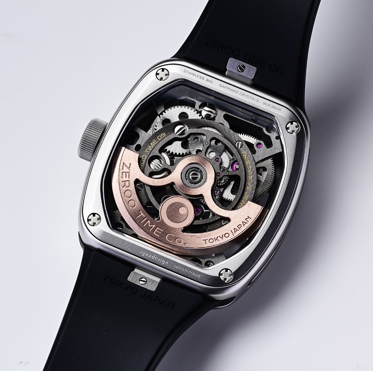 ゼロタイムはトノー型ケースのスケルトンウォッチにこだわった商品開発を続けてきました。T9-01はZEROOの樽型スケルトンウォッチの中で最も磨き上げられたデザインとすべく開発に力を注ぎました。
