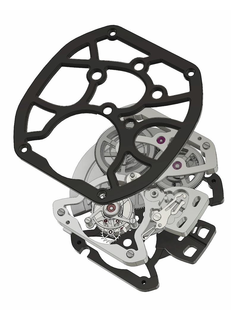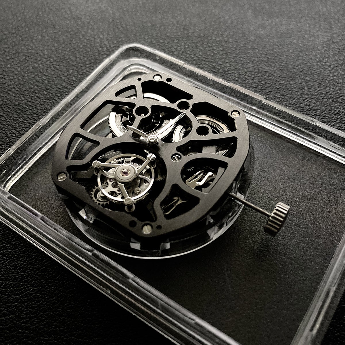 T9-01は、ZEROO T1から続くフルスケルトンのアイデンティティを継承し、ムーブメントを隠さずにケース内に固定するフレーム構造を採用しています。機構を露出させつつもフレーム自体が構造の一部として心臓部をしっかりと保護します。
