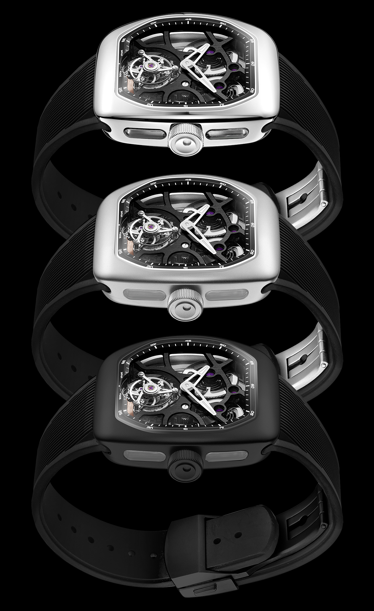 スケルトンのT9-01には3つのカラーバリエーションをご用意しました。シルバー色のケースにはサテン仕上げ(Satin/艶消し)と鏡面仕上げ(Polish)があります。Blackケースはサテン(Satin/艶消し)仕上げのみです。