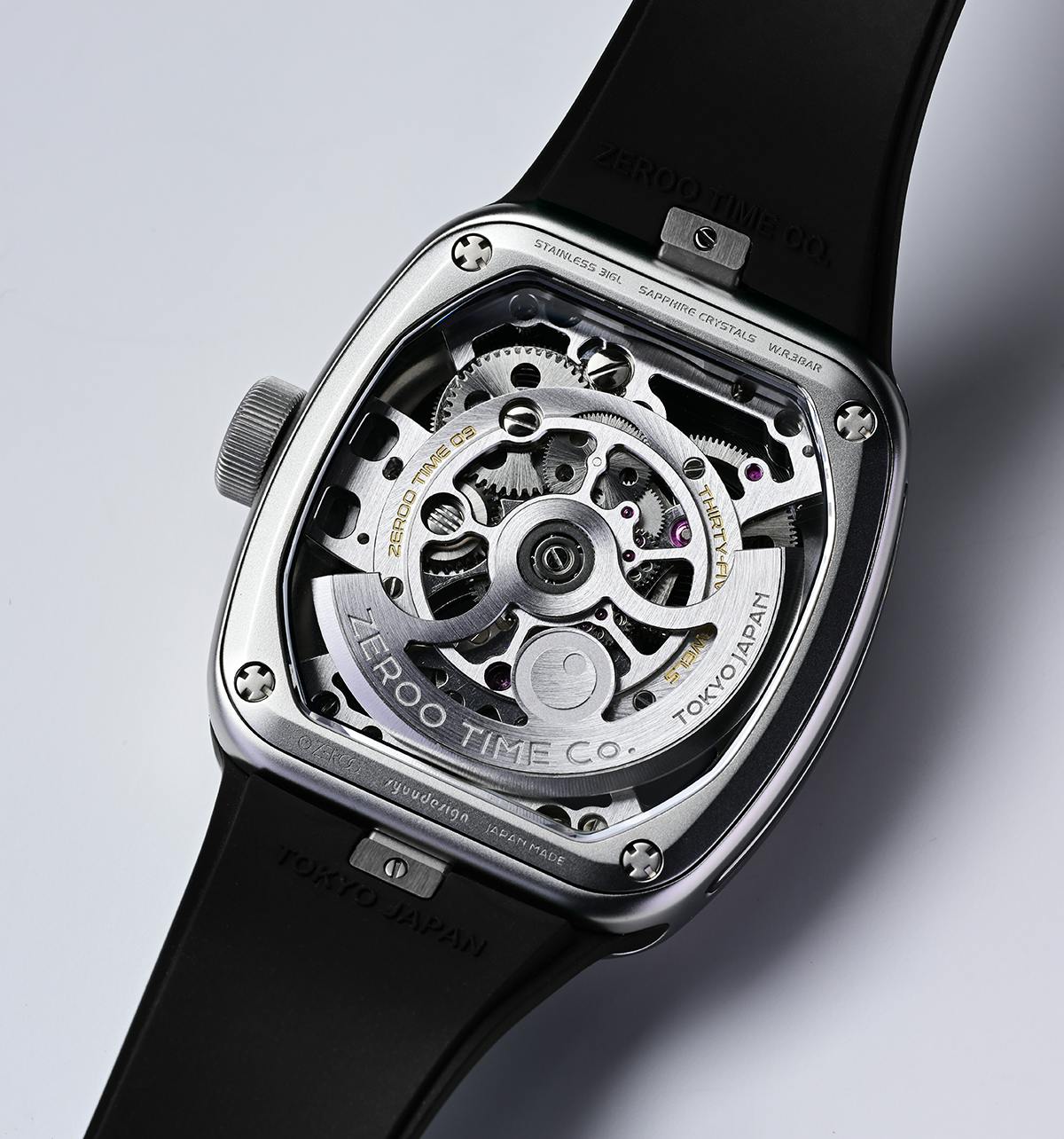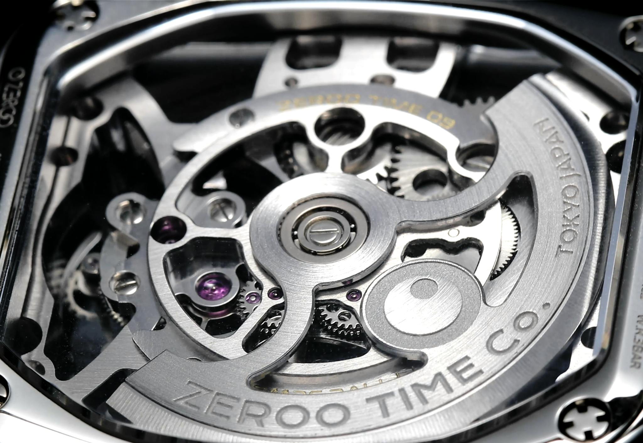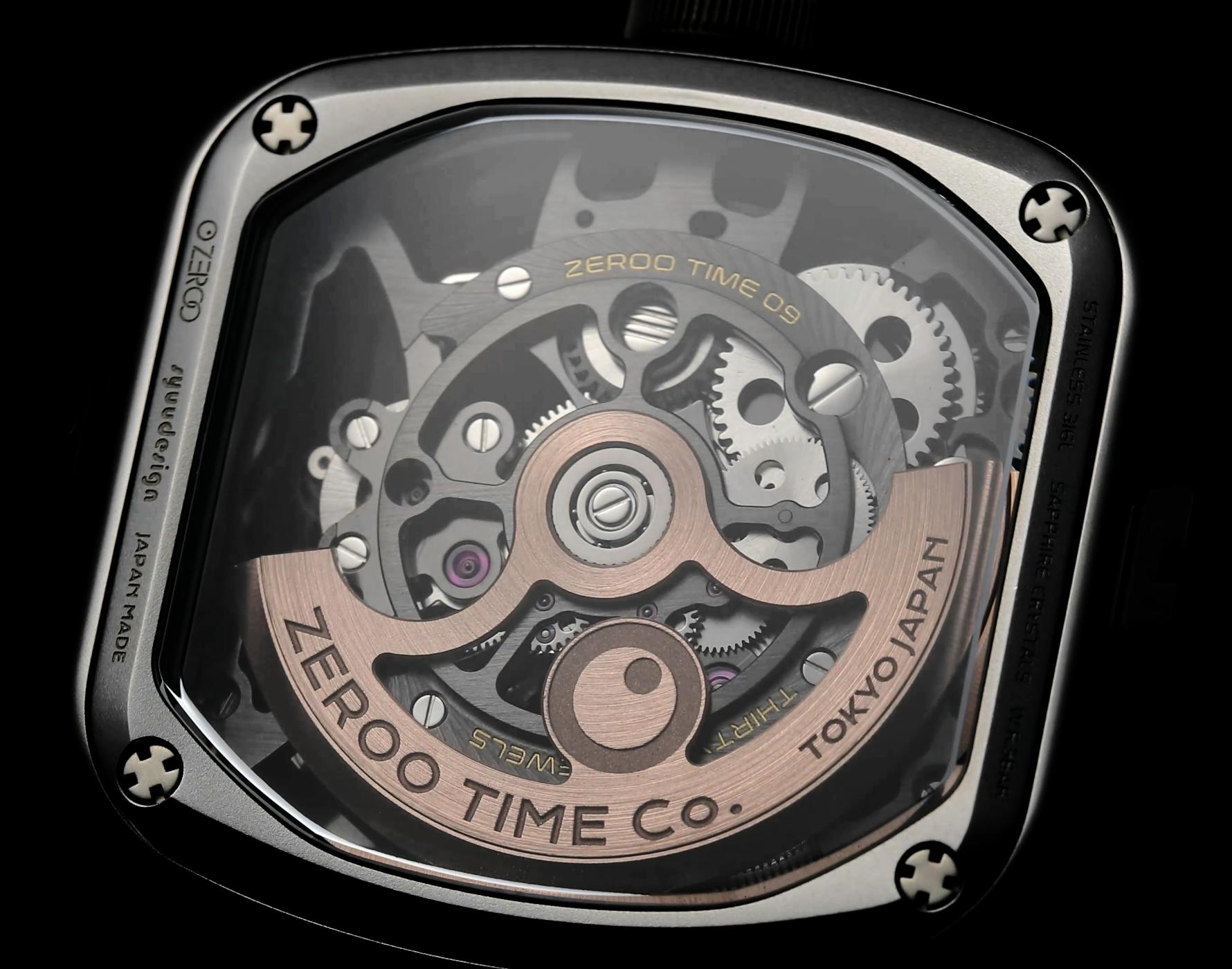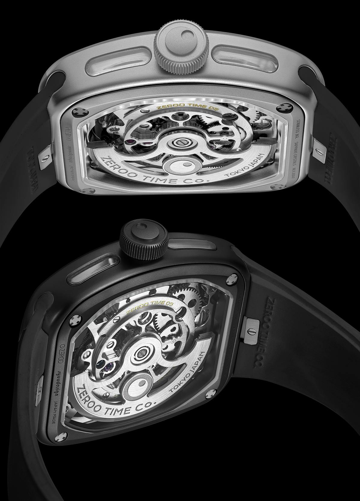 ケースの側面にはムーブメントの内部が見える小窓があります。美しいムーブメントを隠すのではなくケースをスケルトン化することで中の機構も見て楽しむという、ZEROOの基本コンセプトがT9 & T9-01にも受け継がれています。