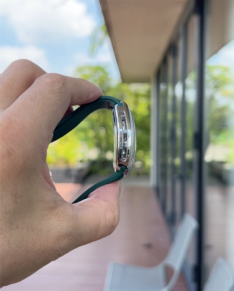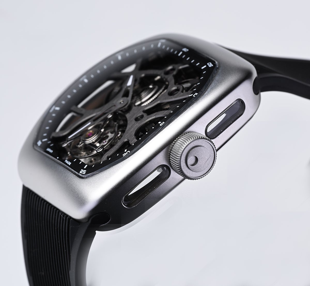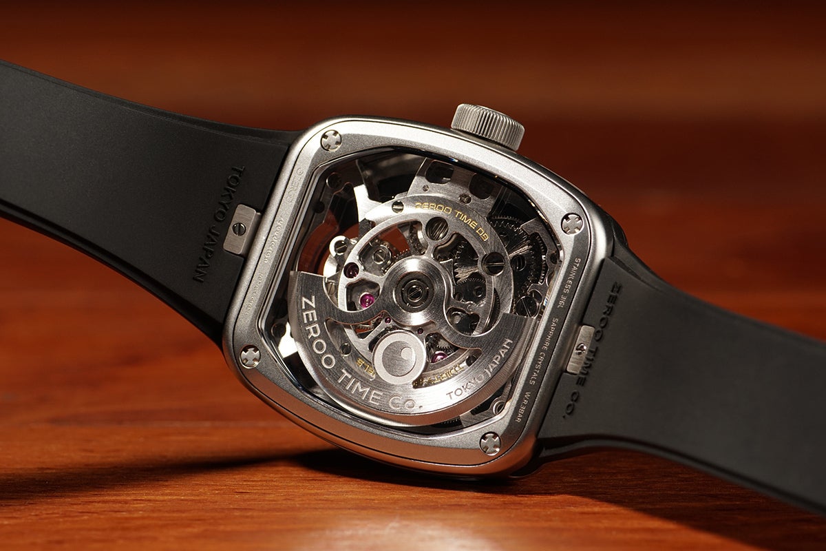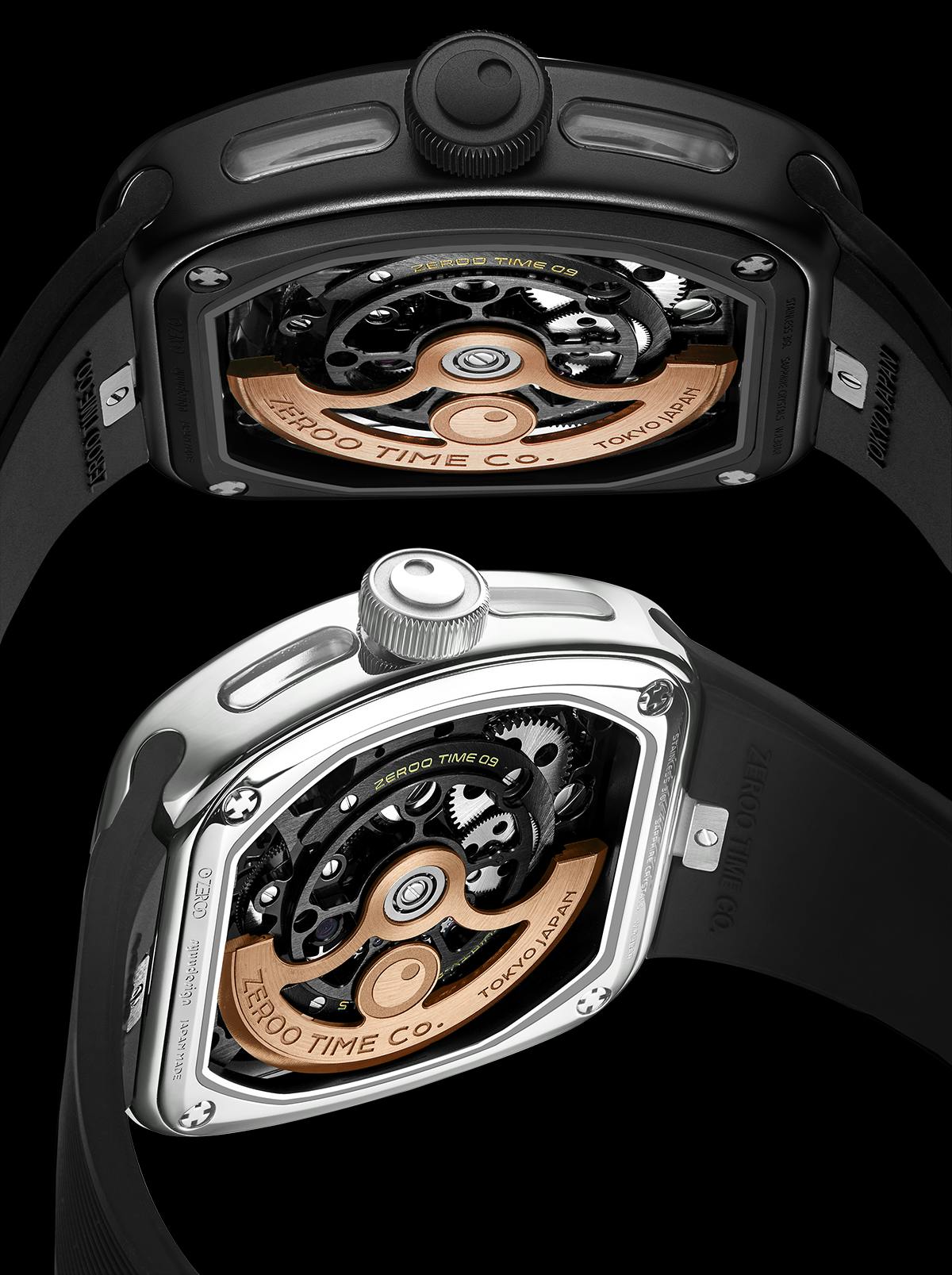 ケースの側面にはムーブメントの内部が見える小窓があります。美しいムーブメントを隠すのではなくケースをスケルトン化することで中の機構も見て楽しむという、ZEROOの基本コンセプトがT9 & T9-01にも受け継がれています。
