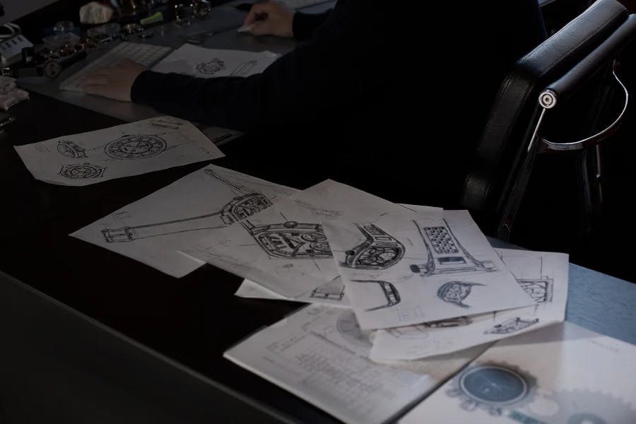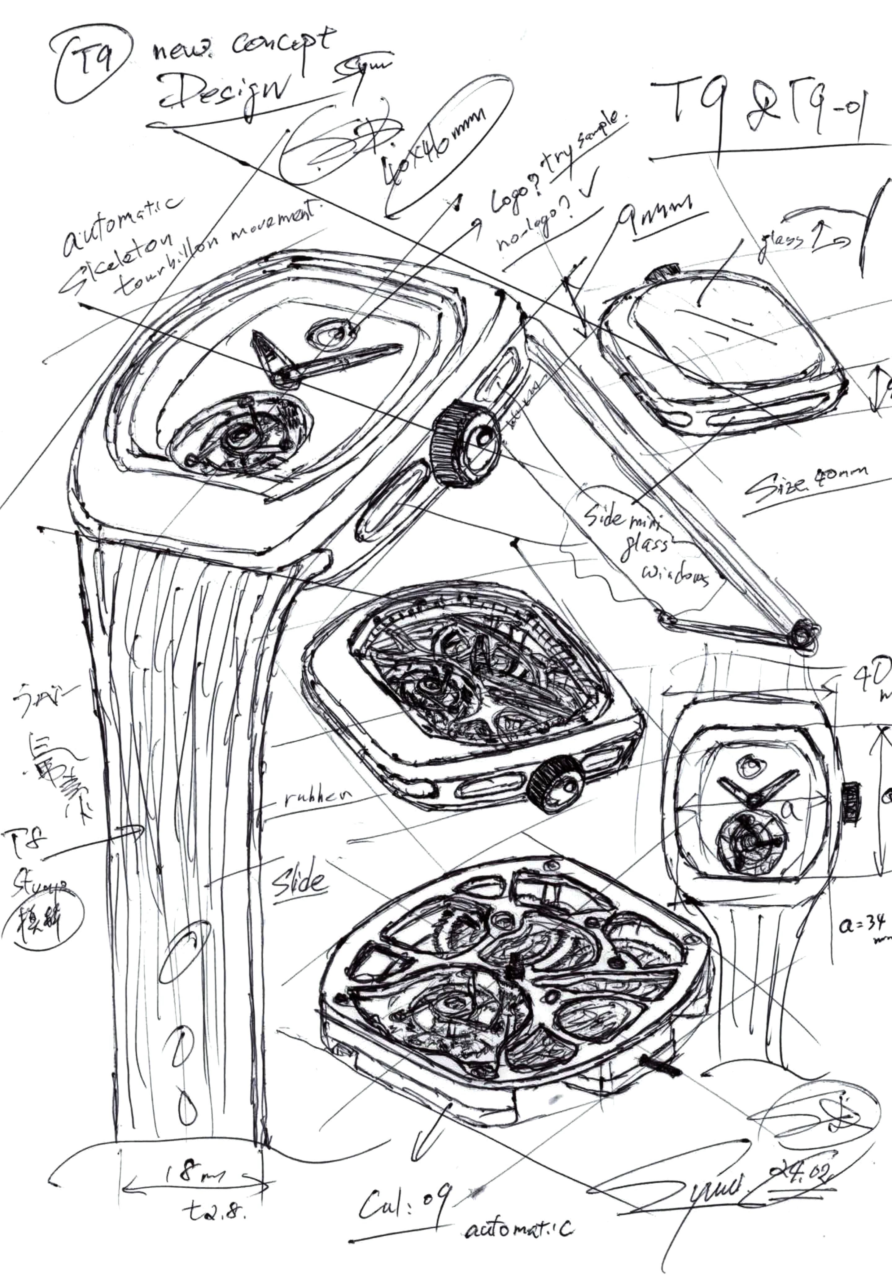 T9 & T9-01のデザインスケッチ開発が簡単に進むモデルなどひとつもありません。今回のT9 & T9-01は新しく美しい自動巻トゥールビヨンを格納するのに相応しいケースを生み出そうと、デザインの試行錯誤を繰り返しました。