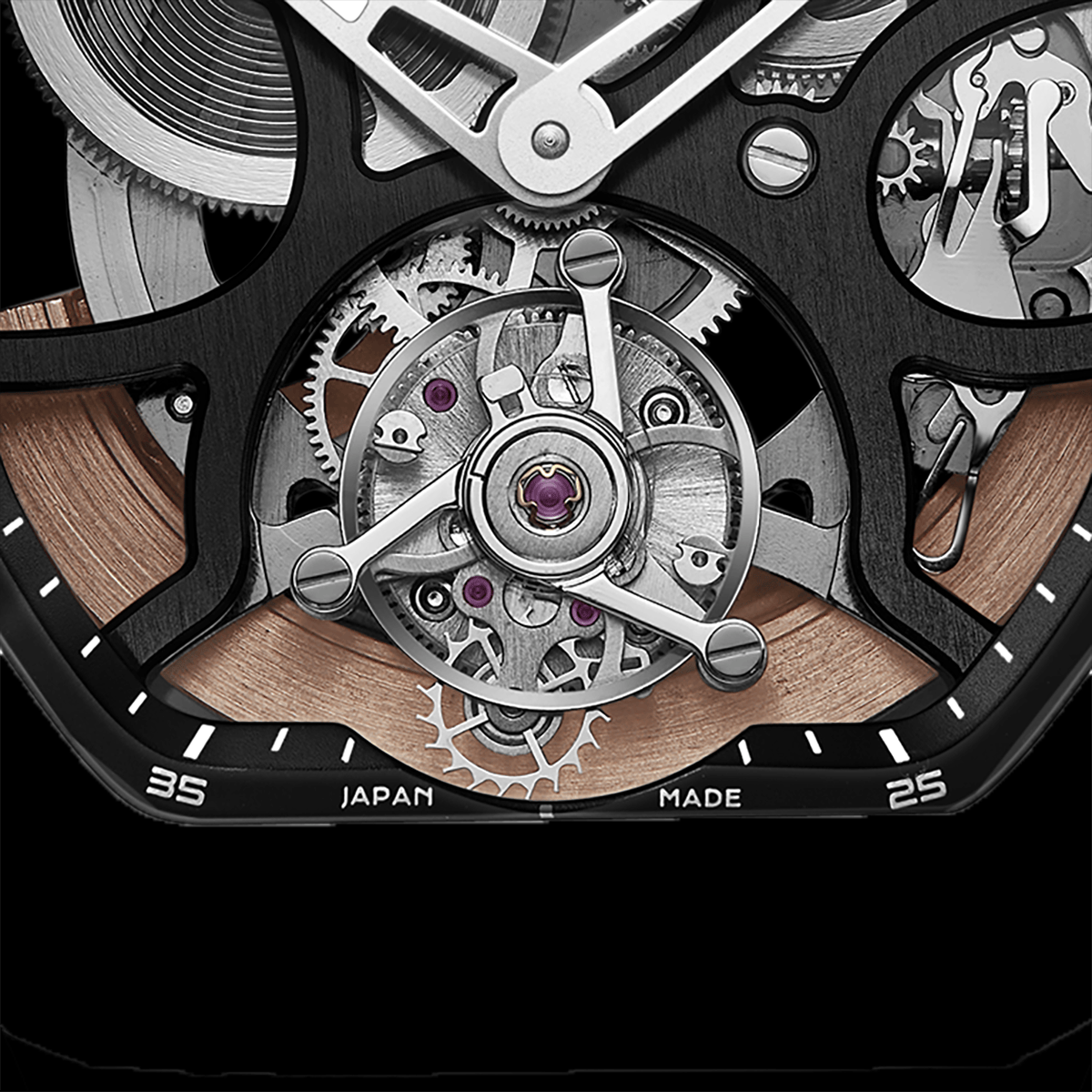 T9-01は、ブランドのアイデンティティであるスケルトン仕様を継承しながらも新世代ZEROOのスケルトントゥールビヨンとして設計。新しい樽型ケースのカーブトーンにジャストマッチするようダイアルフレームやローターなど全てのデザインを再構築しました。