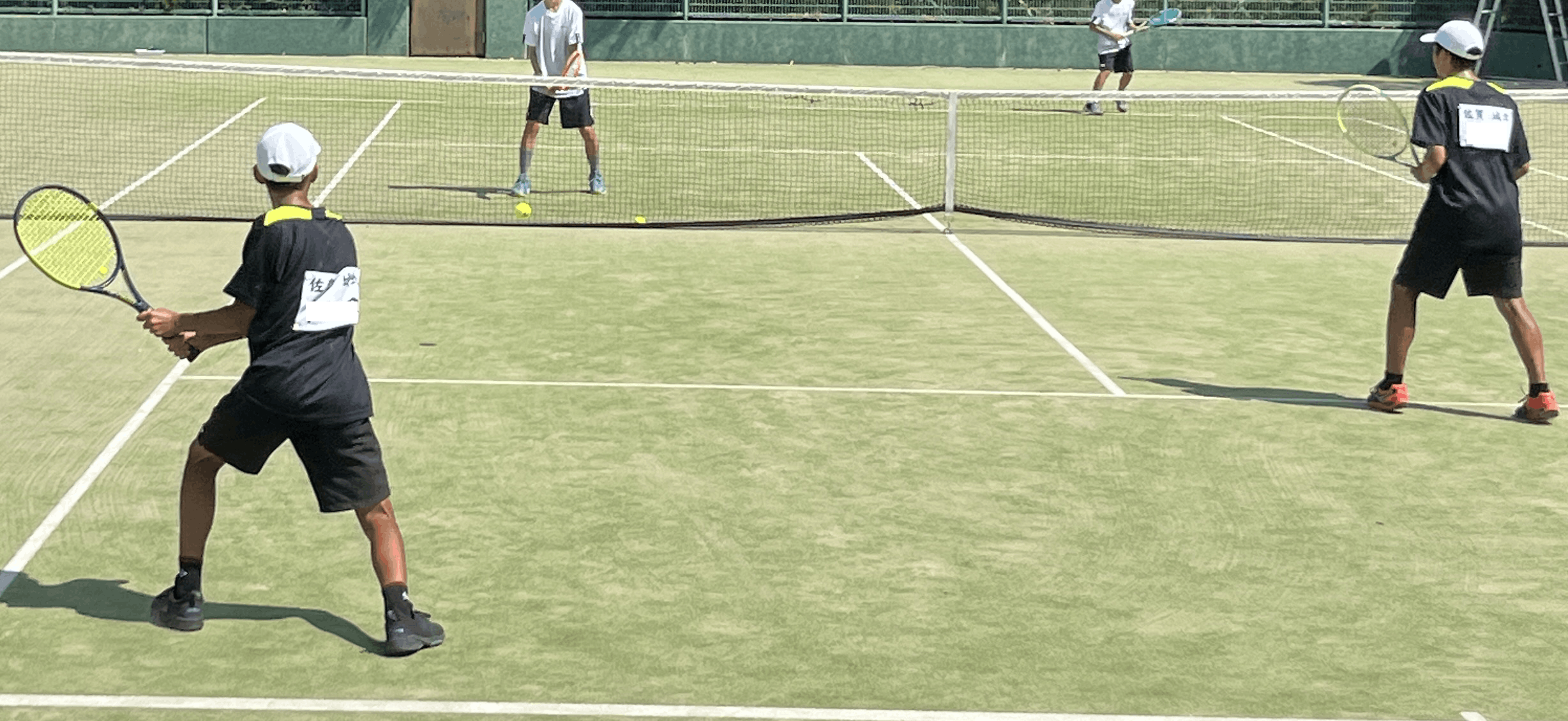 熱中症対策をしながら保護者の見守りのもと大好きなテニスに没頭しています。