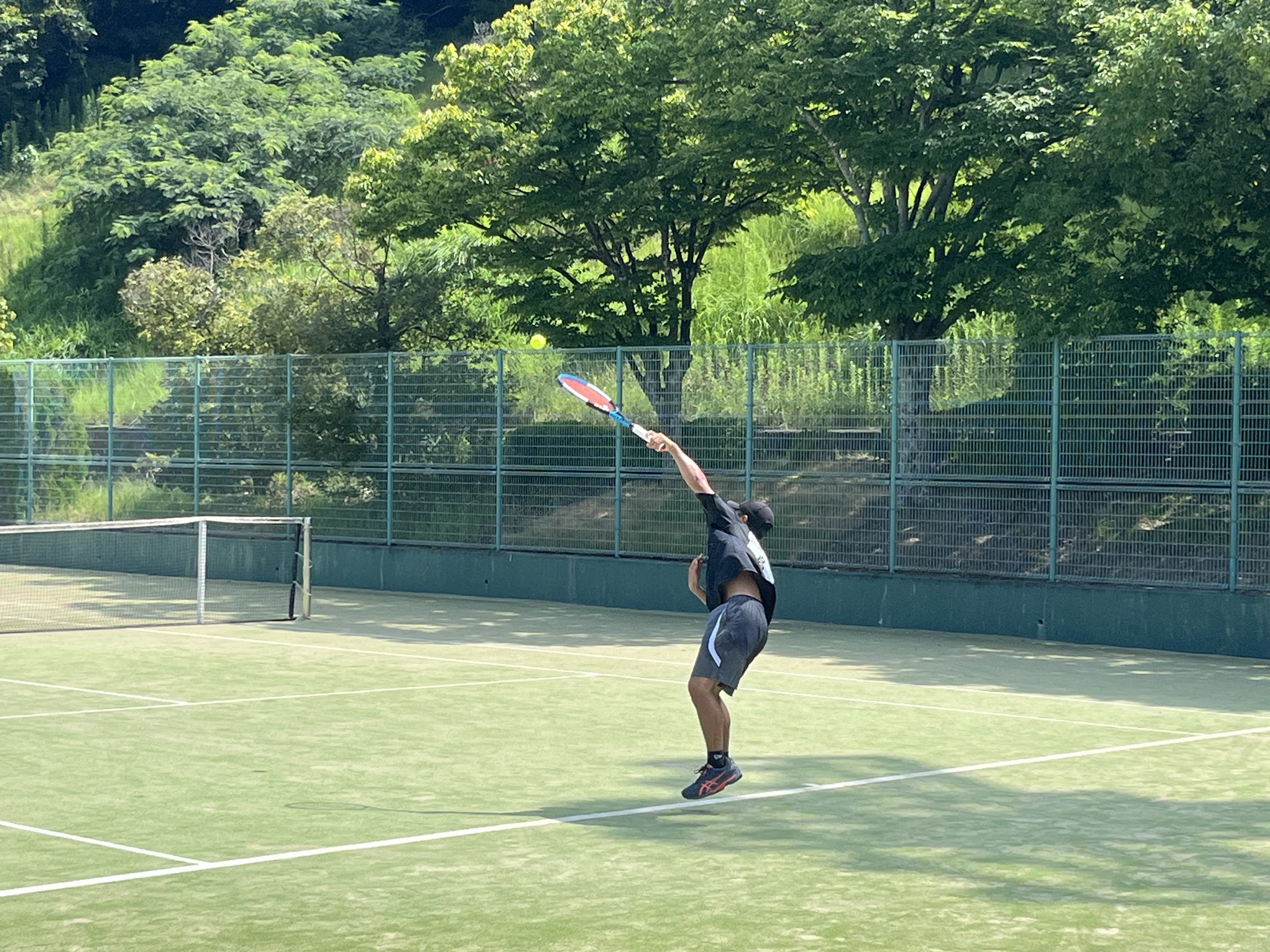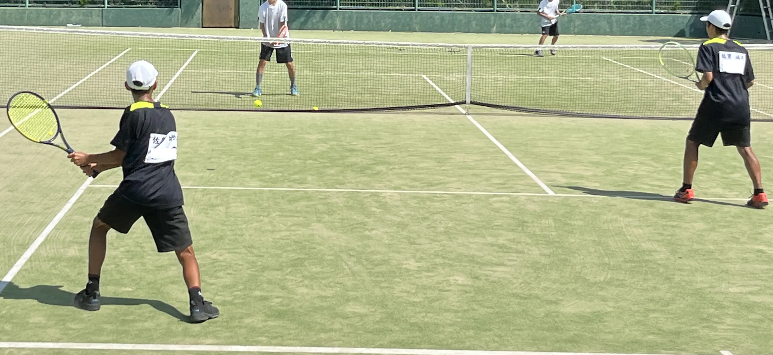 熱中症対策をしながら保護者の見守りのもと大好きなテニスに没頭しています。