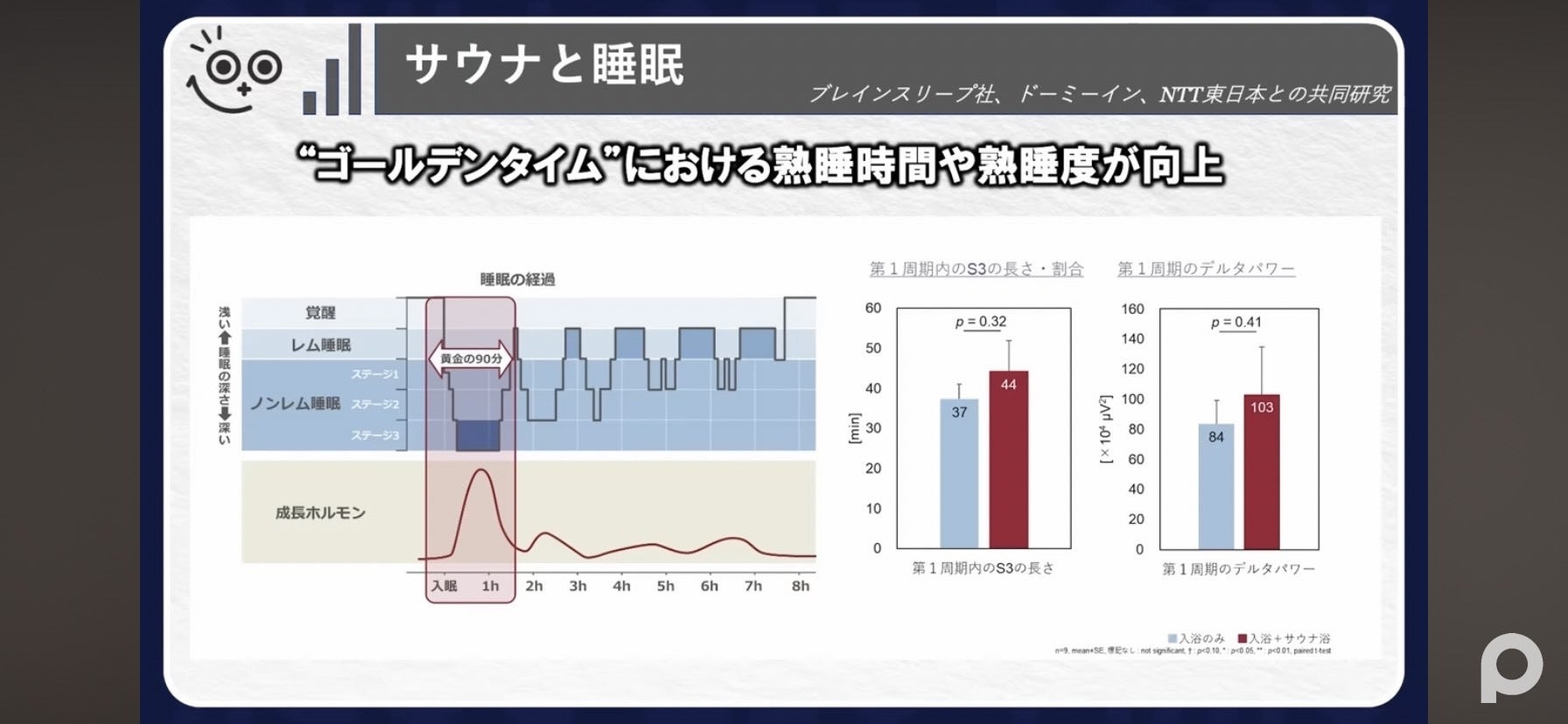 この表を要約すると、サウナに入ると深い睡眠であるノンレム睡眠の時間が