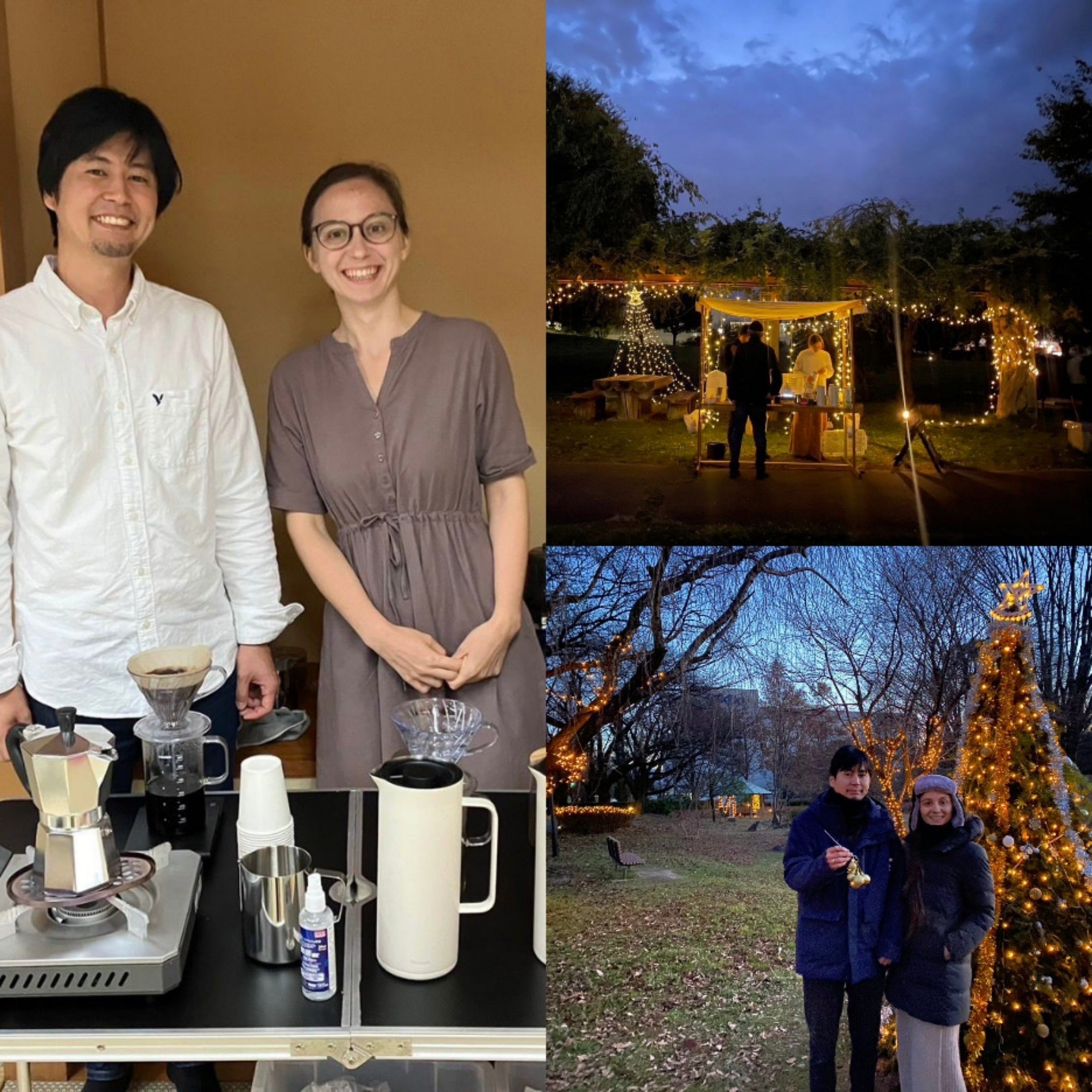 夜のみのわ天竜公園でコーヒーを淹れました。公園の木々をクリスマス・イルミネーションで飾り、高さ3メートルのクリスマス・ツリーを立てて華やかに飾ったり、クリスマスには、子どもたちにおいしいお菓子のプレゼントを贈りました。