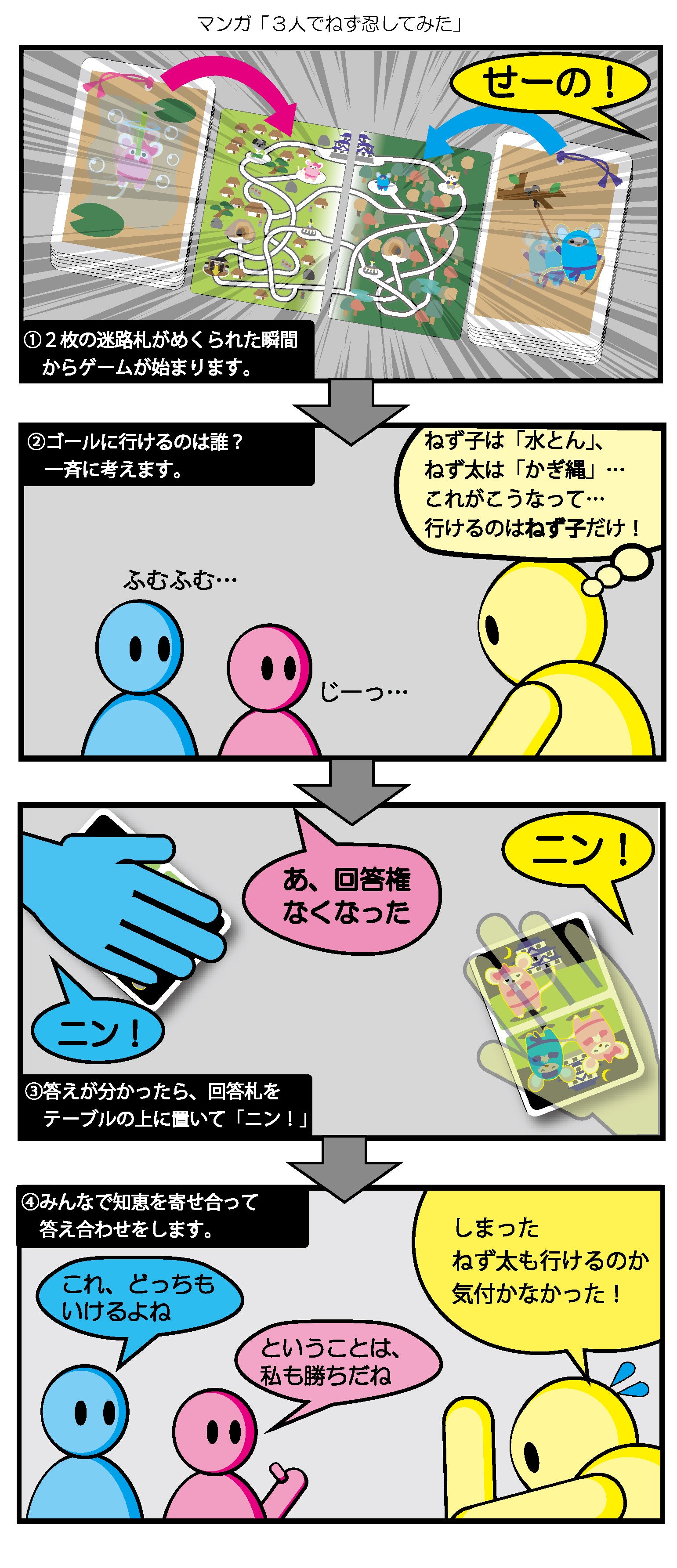 2~4人で遊びます。2匹のねずみがゴールできるかどうかを見極めるスピード勝負です。答えが分かったら、大きな声で「ニン!」といい、回答札をテーブルに置きましょう。回答できないのは、最後の一人だけ。つまり、4人プレイなら、3人が回答した時点で、答え合わせをします。