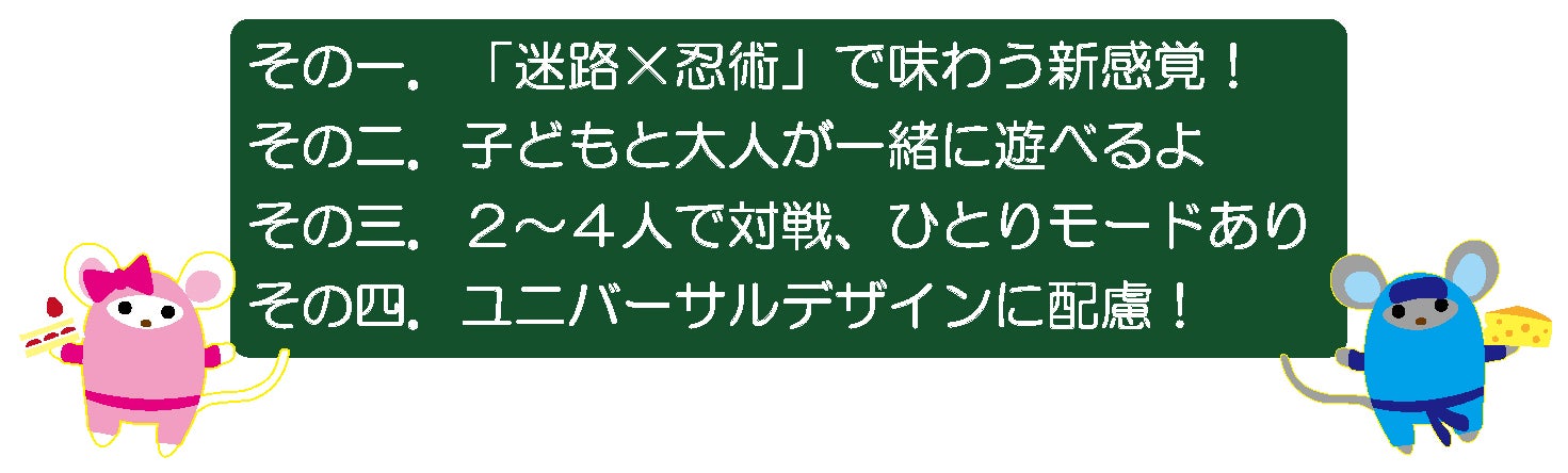 『ねず忍(にん)』は、誰でも知っている『迷路』に『忍術』を掛け合わせた、新感覚のボードゲームです。ルールは簡単ながら、ゲームならではの仕掛けがあり、子どもから大人まで楽しむことができます。また、対戦モードと一人モードがあります。さらに、カードには文字がなく、色の区別も必要ない、ユニバーサルデザインなゲームを目指しました。