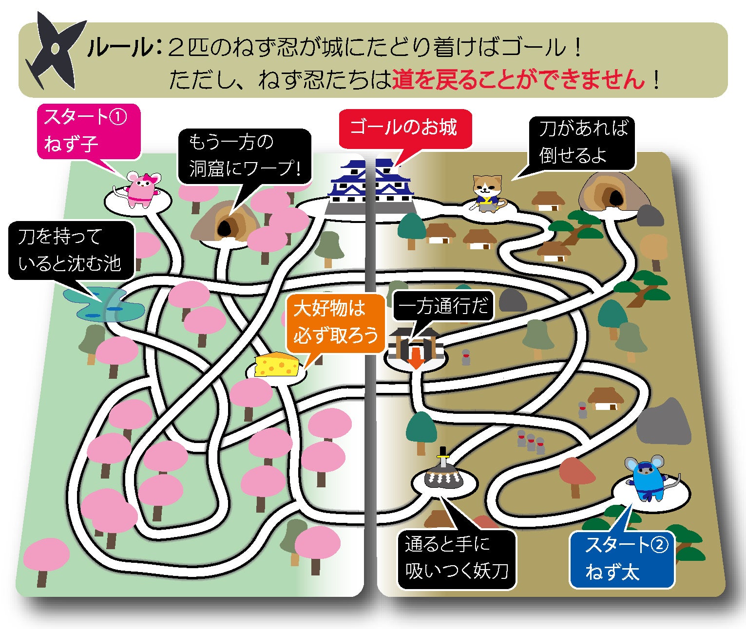 迷路は「ねず子」(左)と「ねず太」(右)からスタートし、ゴールのお城を目指します。