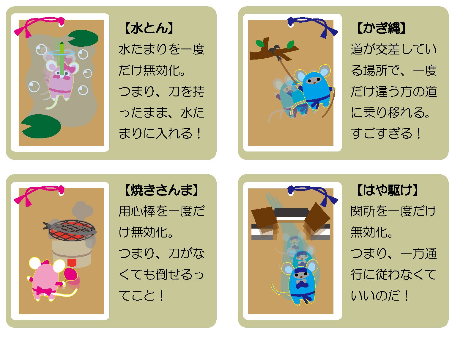ここで、このゲーム最大のしかけである「忍術」の登場です!ねず忍は、ランダムに一つだけ忍術が使える状態でゲームが始ります!