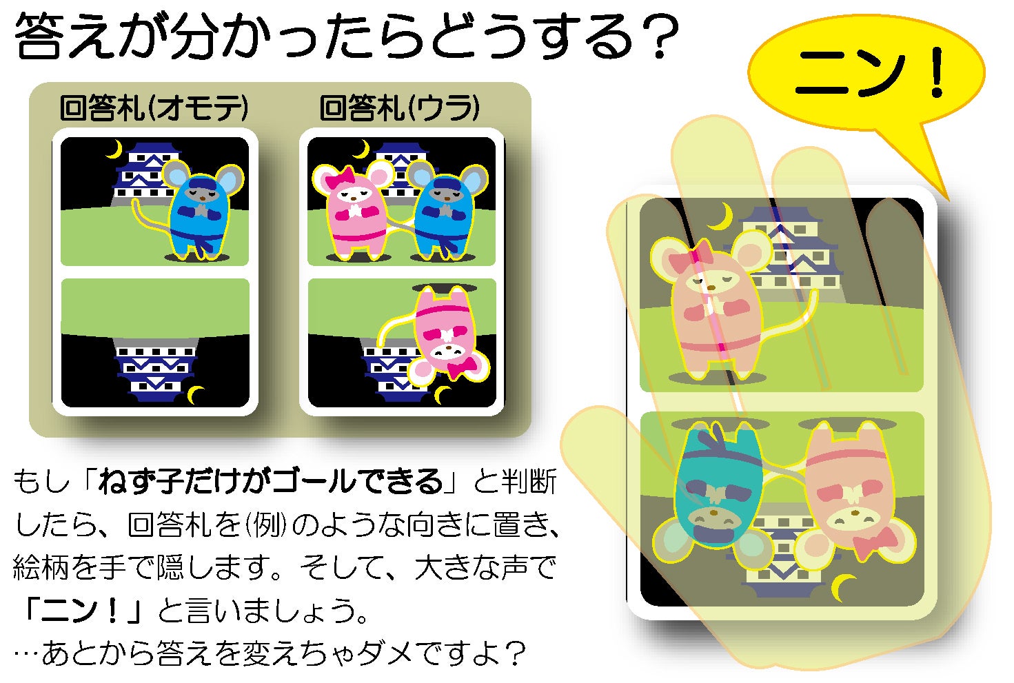 2~4人で遊びます。2匹のねずみがゴールできるかどうかを見極めるスピード勝負です。答えが分かったら、大きな声で「ニン!」といい、回答札をテーブルに置きましょう。回答できないのは、最後の一人だけ。つまり、4人プレイなら、3人が回答した時点で、答え合わせをします。
