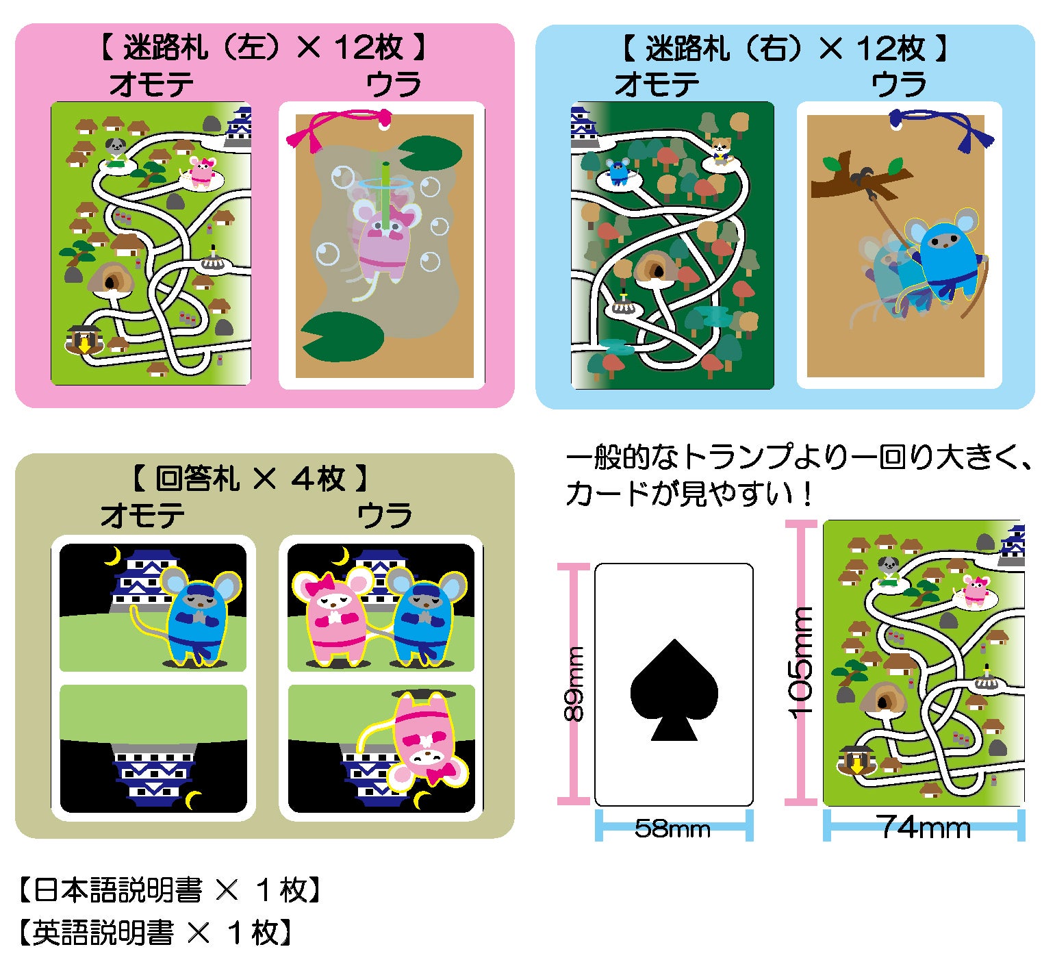 28枚のカードが入っています。カードサイズは、迷路を見やすくするために、一般的なトランプよりも大きいものを採用しました。(A7サイズ)
