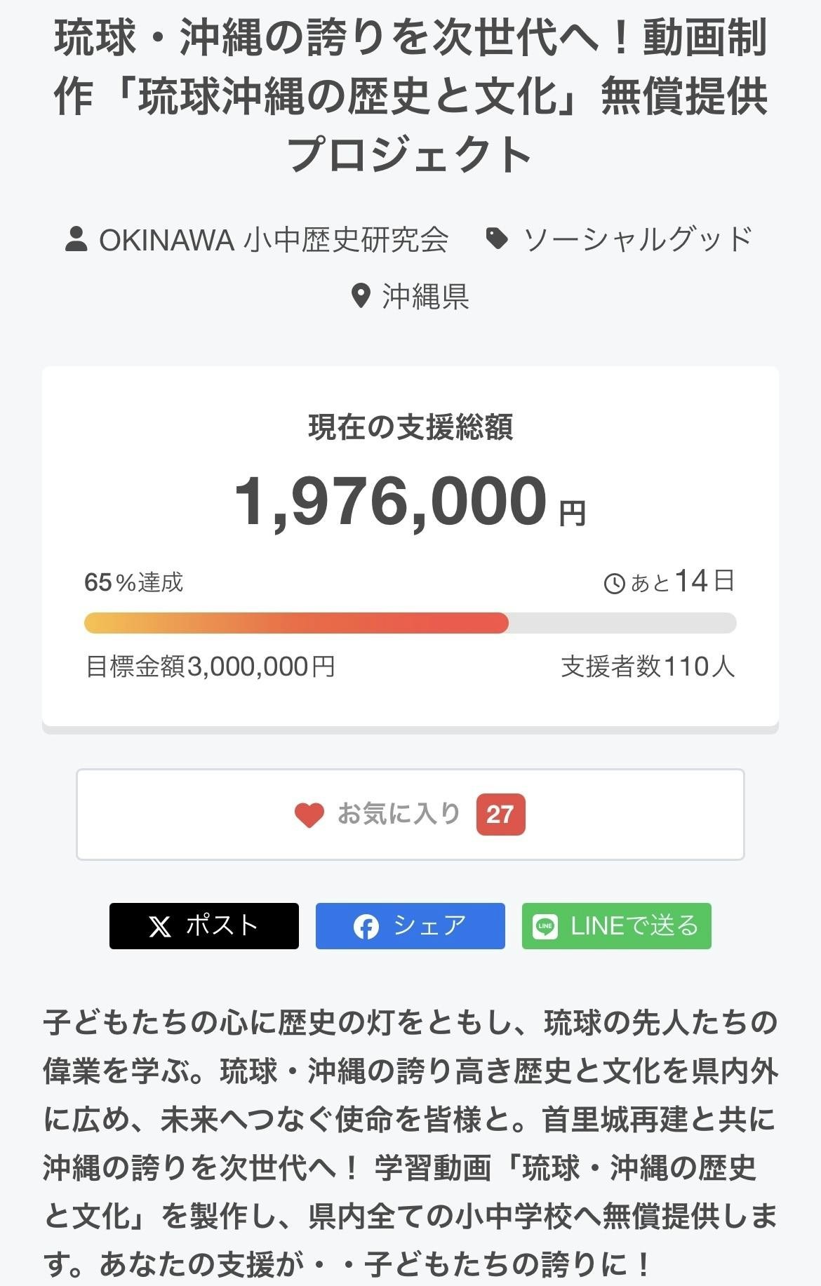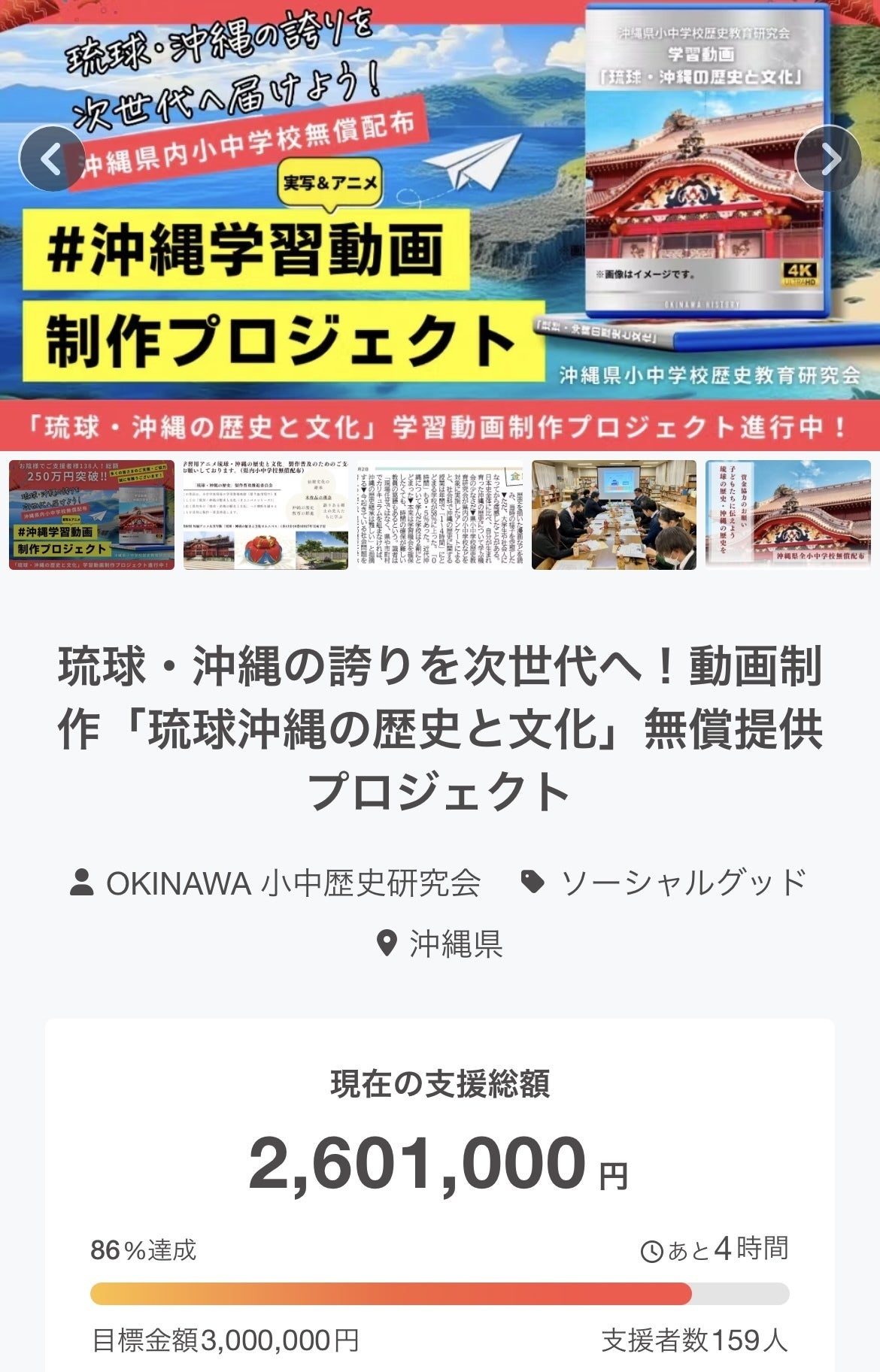 2025/01/18 19:13はいたい!「琉球・沖縄の歴史と文化」学習動画制作プロジェクト事務局広報担当の崎原有希でございます!「琉球・沖縄の歴史と文化」学習動画制作プロジェクトのクラウドファンディングも、いよいよ残り4時間となりました!これまで、クラウドファンディングを通じて159の企業・団体・個人の皆さまから温かいご支援をいただき、現在第一目標の86%に到達しております。皆さまのお力添えに心より感謝申し上げます!ここまで走り抜けてくることができたのは、皆さまのおかげです。遂に目標達成まで、あともう少しのところまで来ました!最後のお願いになりますが、引き続きご支援やシェアで応援していただけると嬉しいです!このプロジェクトを成功させることで、琉球・沖縄の豊かな歴史と文化を未来へとつなぐ一歩を築きたいと考えております。どうか、最後の最後まで私たちにお力添えをいただけますと幸いです!▼プロジェクトページはこちらhttps://camp-fire.jp/projects/786031/view皆さまの温かい応援が、私たちの原動力となります。最後のお願いとなりますが、どうぞよろしくお願いいたします!「琉球・沖縄の歴史と文化」学習動画制作プロジェクト事務局広報担当崎原有希 もっと見る琉球・沖縄の誇りを次世代へ! 「琉球・沖縄の歴史と文化」学習動画製作クラウドファンディング終了まで のこり10日!