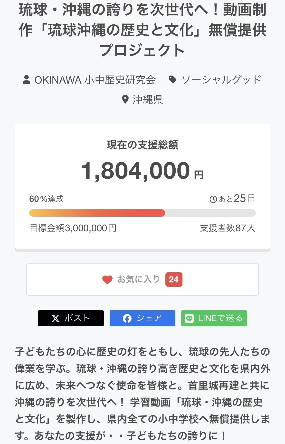 終了まで 残り25日 となり、いよいよ最終段階に突入します。このプロジェクトが未来の子どもたちへ琉球・沖縄の歴史と文化を届ける一歩となるよう、最後まで全力で進めてまいります。