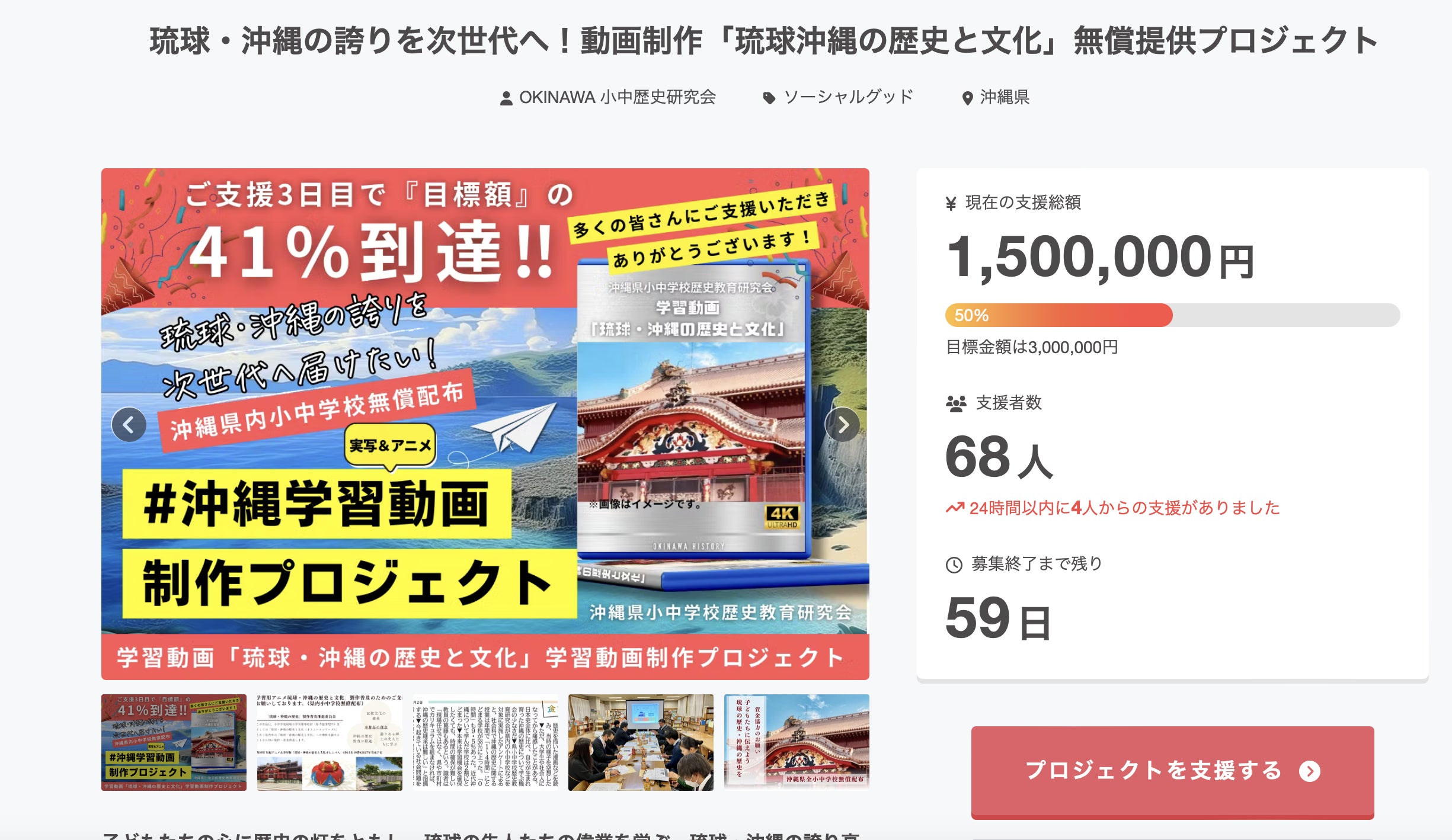クラウドファンディングを公開してから20日、目標金額の 50%に到達 しました!ここまで来られたのは、皆さま一人ひとりの温かいご支援のおかげです。本当にありがとうございます!寄せられた応援の声やメッセージから、「この動画を通じて次世代に誇りを伝えたい」という多くの思いが共有され、私たちもますます熱意を持って取り組んでいます。しかし、まだプロジェクトは途中段階。「琉球・沖縄の歴史と文化」を未来の子どもたちへ繋ぐためには、引き続き皆さまのご協力が欠かせません!プロジェクトページを見るご支援はこちらから締切まであと60日を切りました。「少しでも応援したい」と感じていただけましたら、ご支援だけでなく、この活動を周りの方々にシェアしていただけると、とても心強いです。一人ひとりのご協力が、沖縄の未来を変える大きな一歩に繋がります!皆さまと共に、この夢を実現できることを心から願っています。どうぞよろしくお願いいたします!【クラウドファンディング応援LINEオープンチャット】こちらでも活動報告、意見交換を行っておりますので登録お願い致します。オープンチャットはこちら