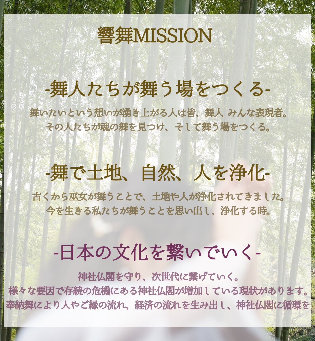響舞プロジェクトは、私達が作り上げた「響舞」という舞により、皆様の想い・願いを神社仏閣へ届けるとともに、ご支援・ご協賛頂いた資金をもとに、神社仏閣を守り、次世代に繋げていく事がミッションです。
