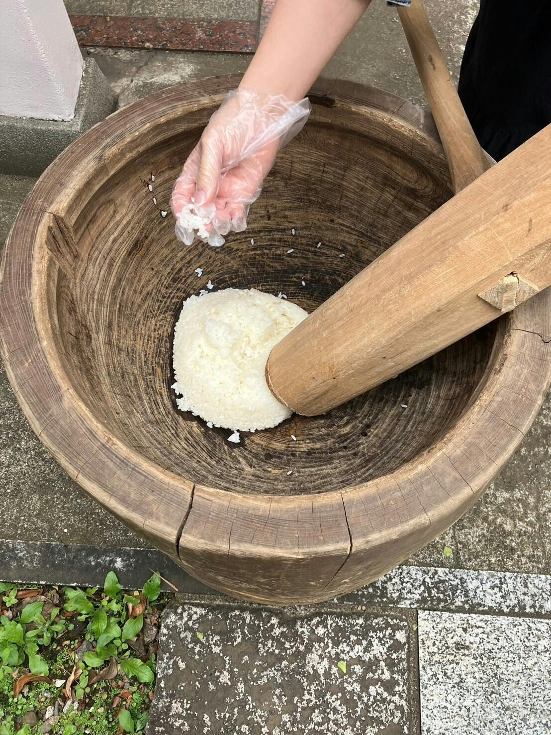 杵とうすを使ってみんなで、餅つき。