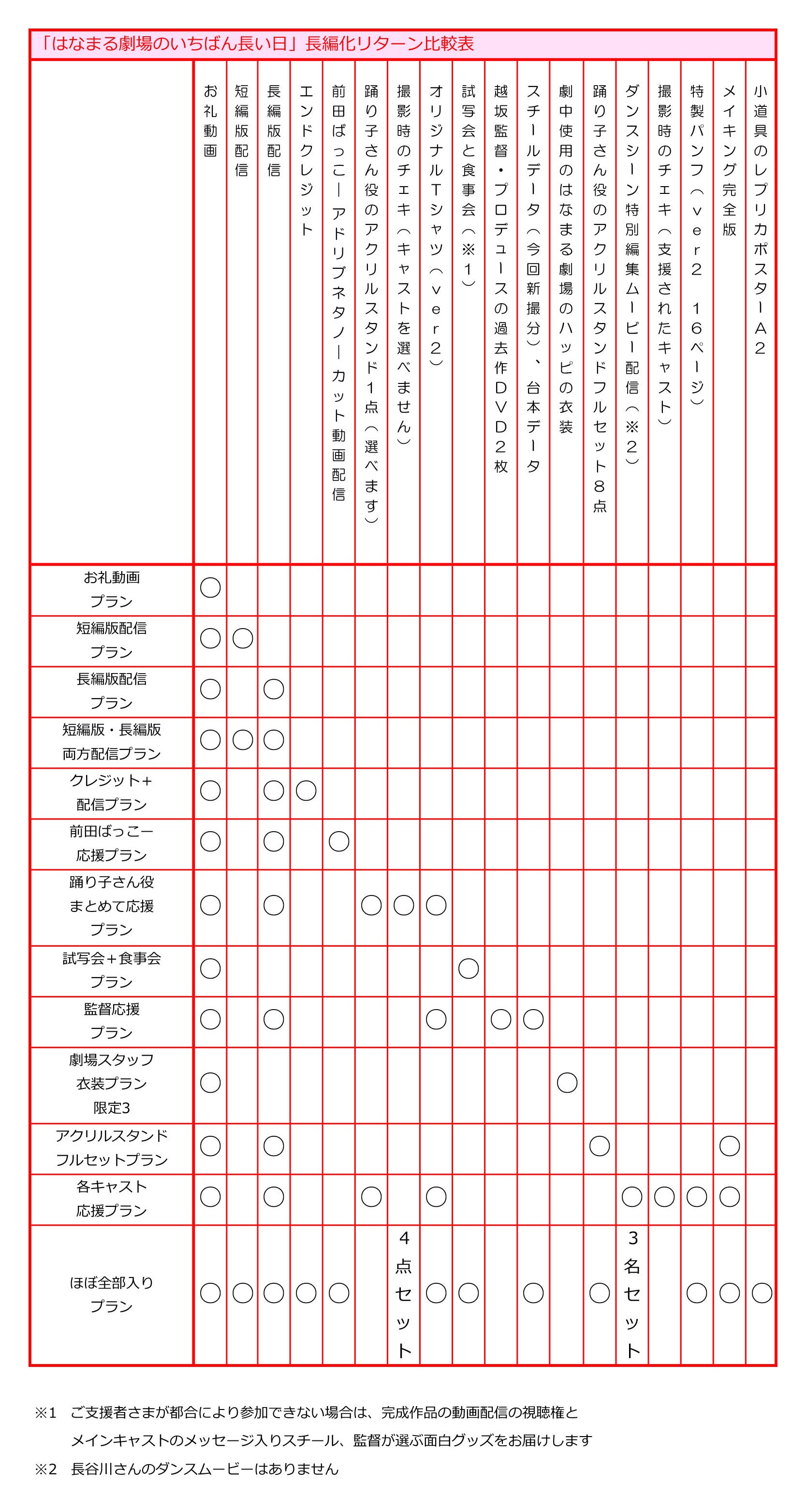 また、クラウドファンディング終了後に「支援したかった」とのありがたいお声もお聞きしております。短編版完成のこの機会に長編版に向けて挑戦したいと考えます。今回も「はなまる劇場」の世界観を構築する様々なリターンをご用意しましたので、ご支援・ご協力をお願いいたします!