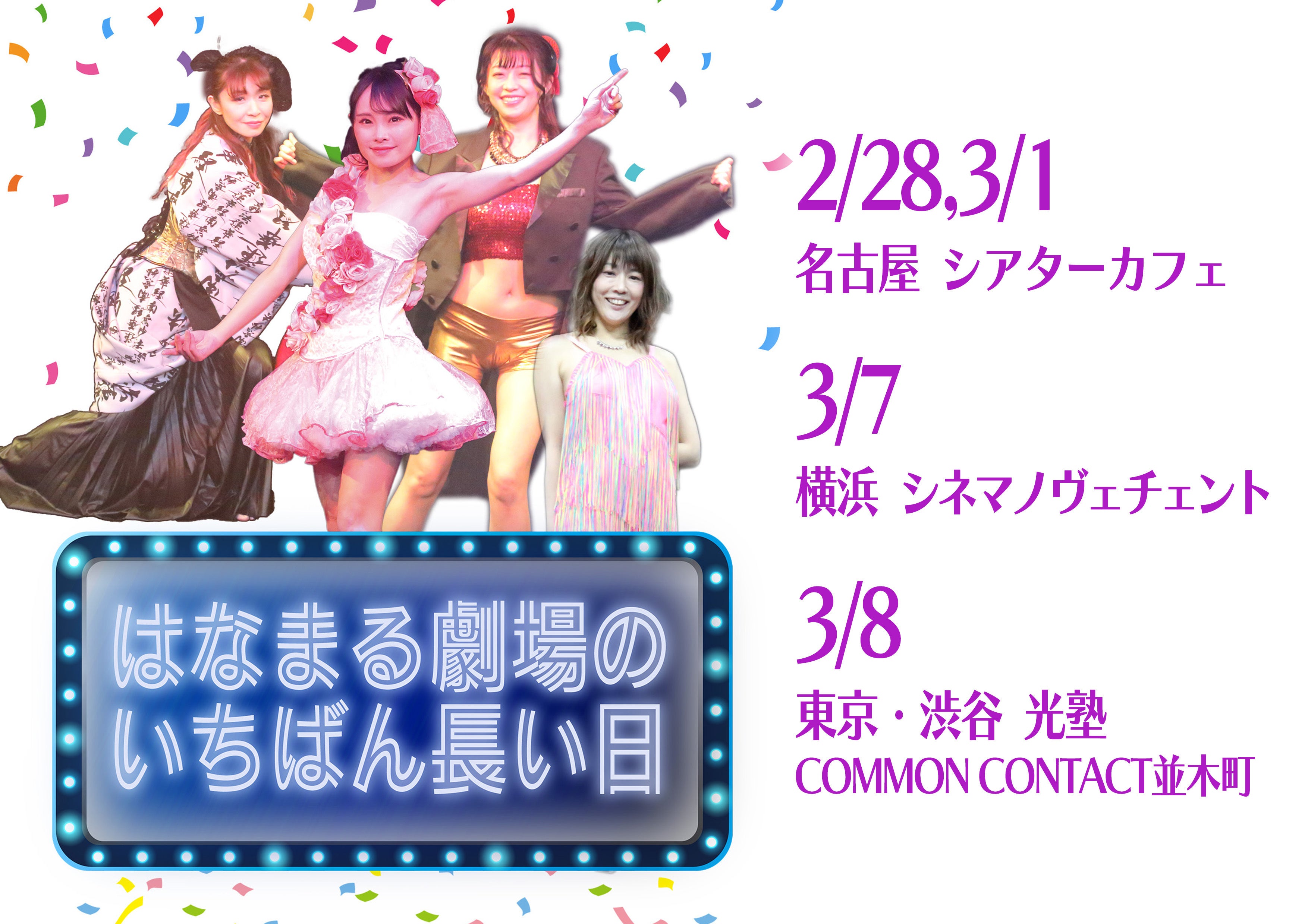 2026/01/27 21:57おかげさまをもちまして「はなまる劇場のいちばん長い日」が1月30日、ついにDVDリリースされます!(現在、各オンラインストアなどで予約受付中)これを記念しまして、名古屋、横浜、東京・渋谷でリリース記念上映・トークイベントを開催。各会場でもDVDの販売をいたします。よければ一緒にお祝いしてください。予告 2月28日(土)3月1日(日) 15:00/17:10名古屋 シアターカフェ(劇場HPにてご予約中)愛知県名古屋市東区白壁4-9名古屋市バス・基幹2/名鉄バス「清水口」駅から徒歩1分・名古屋市営地下鉄・名城線「名古屋城(旧・市役所)」駅②番出口から徒歩12分他https://theatercafe.jp/new/ ゲスト予定2/28 15:00の回 初咲里奈・範田紗々・つつじあゆこ・越坂康史監督2/28 17:10の回 初咲里奈・範田紗々・越坂康史監督3/1 15:00の回 初咲里奈・つつじあゆこ・越坂康史監督3/1 17:10の回 つつじあゆこ・越坂康史監督 他交渉中3月7日(土) 11:00 13:30横浜 シネマノヴェチェント横浜市西区中央2-1-8 旧岩崎ビル2F京浜急行電鉄本線「戸部駅」より徒歩約10分 · 相模鉄道本線「西横浜駅」より徒歩約10分他https://cinema1900.wixsite.com/homeゲスト予定11:00の回 初咲里奈・倖田李梨・若林美保・越坂康史監督13:30の回 初咲里奈・倖田李梨・越坂康史監督 他交渉中 3月8日(日) 15:00/18:30 (17:00メイキング上映あり)東京・渋谷 光塾 COMMON CONTACT並木町東京都渋谷区渋谷3-27-15 光和ビル地下1階東急線、東京メトロ「渋谷駅」(副都心線、半蔵門線)C2出口 徒歩5分・JR「渋谷駅」新南改札 徒歩5分https://hikarijuku.comゲスト予定15:00の回 初咲里奈・倖田李梨・越坂康史監督 他交渉中17:00の回 メイキング(生コメンタリー付き上映 初咲里奈・越坂康史監督)18:30の回 初咲里奈・若林美保・越坂康史監督 他交渉中 料金 2000円均一※シアターカフェは別途ドリンク代(600円〜)が必要です※メイキングは別料金(500円)です もっと見る