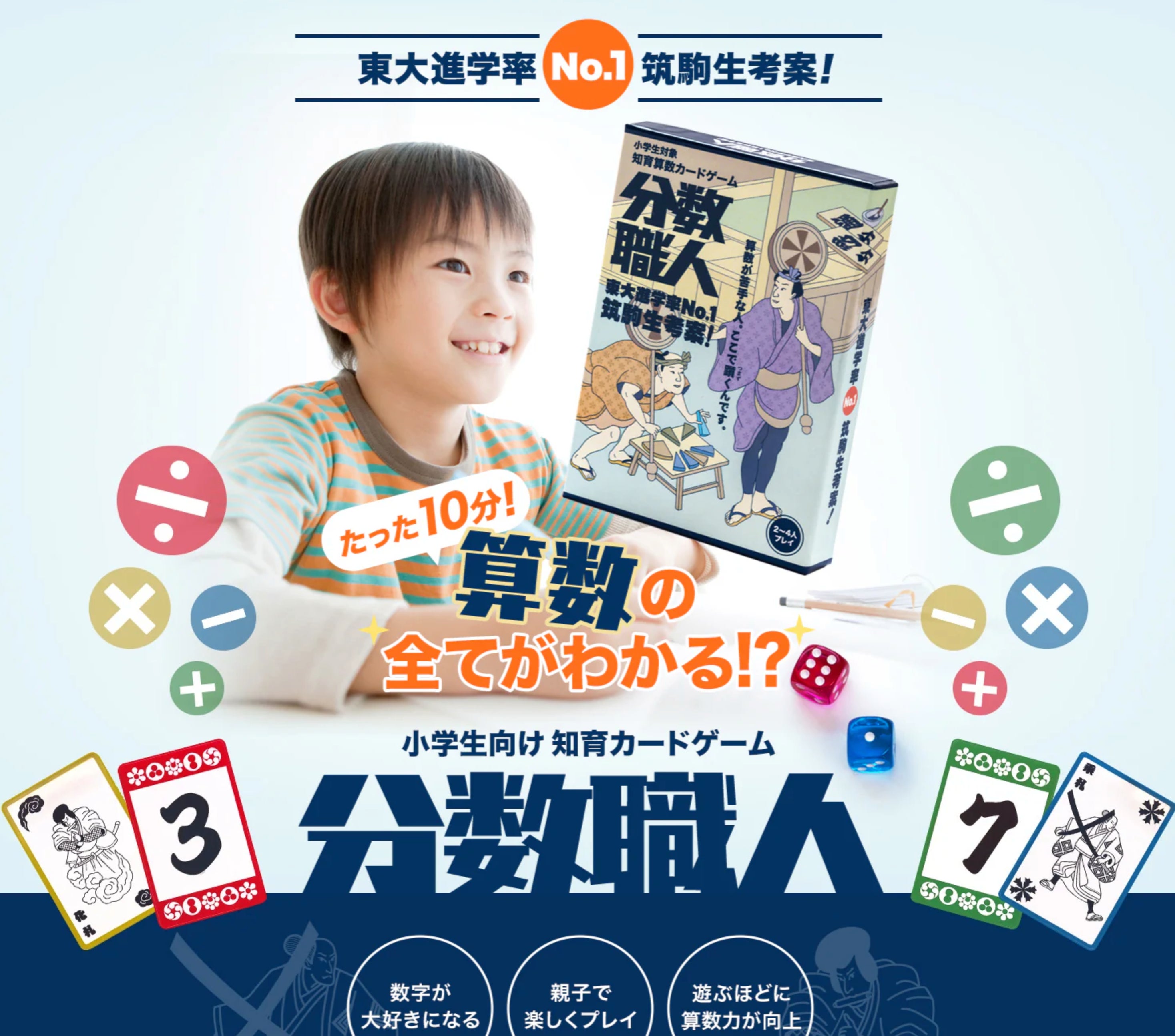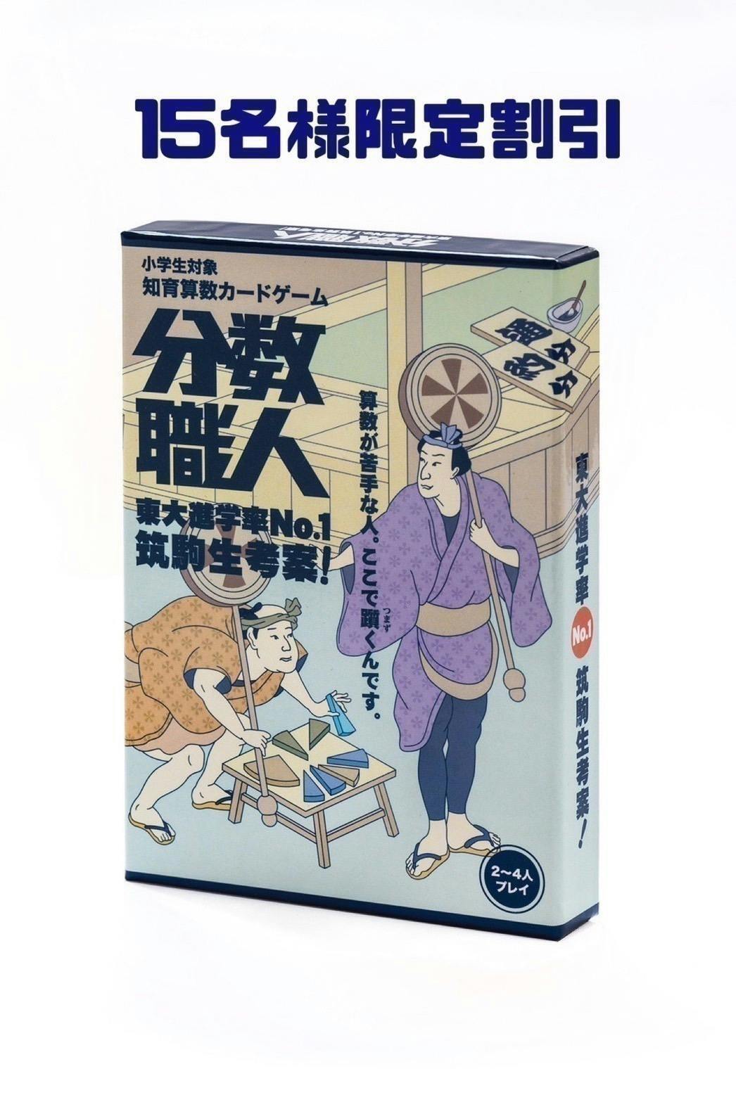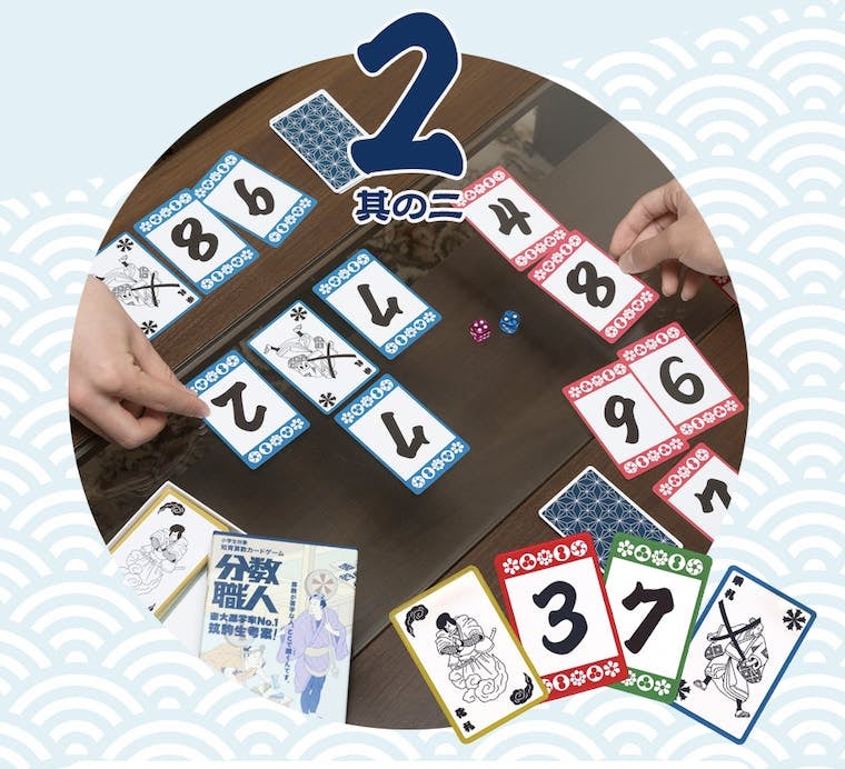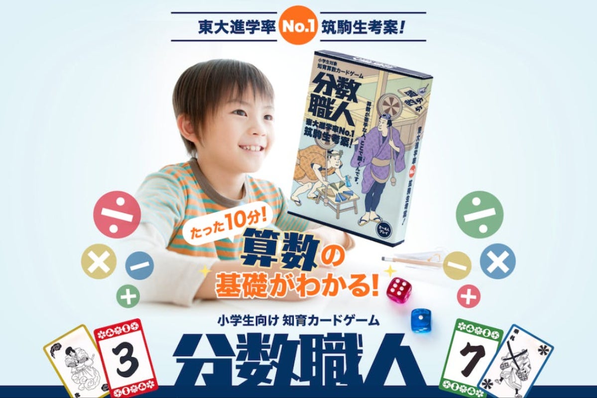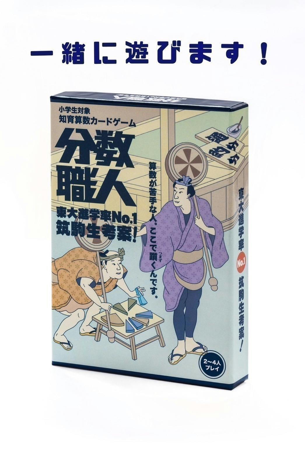 「分数職人」はサイコロで指定されたランダムな分数を手札のカードによって作り、職人のように算数が上手になるカードゲームです。このゲームは東大進学率No.1を誇る進学校”筑波大学附属駒場高等学校”(通称:筑駒)の生徒が考案し、累計1万部をこえる人気知育カードゲームとなりました。