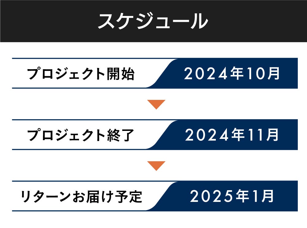 ※本文中に記載させていただいたスケジュールは、あくまでプロジェクト公開時点の予定です。クラウドファンディングの性質上、配送遅延のおそれがございます。原則として、配送遅延に伴うご支援のキャンセルはできませんが、リターン配送予定月から3ヵ月を超えた場合には、希望者に限りキャンセルにて対応させていただきます。